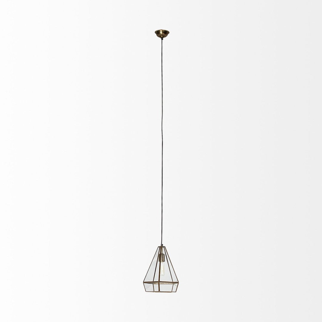 Elevate your interior with the Prima pyramid pendant — a refined blend of Art Deco glamour and European-inspired luxe. Its clean geometric silhouette and antiqued-gold metal frame surround clear glass panels to create a radiant focal point that complements dining areas, foyers, bedrooms, and boutique commercial spaces. Crafted for both style and stability, this fixture brings polished sophistication and an immediate sense of elegance to any room.