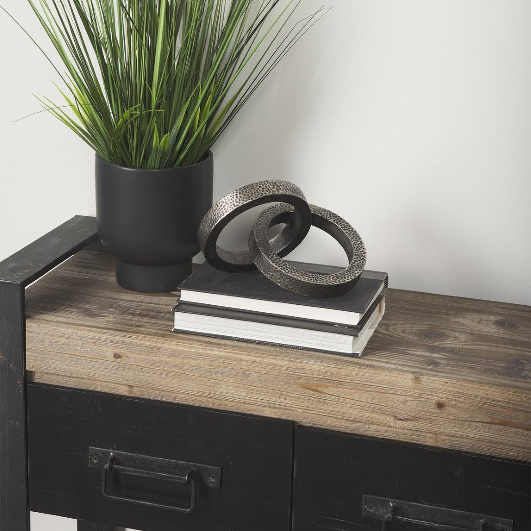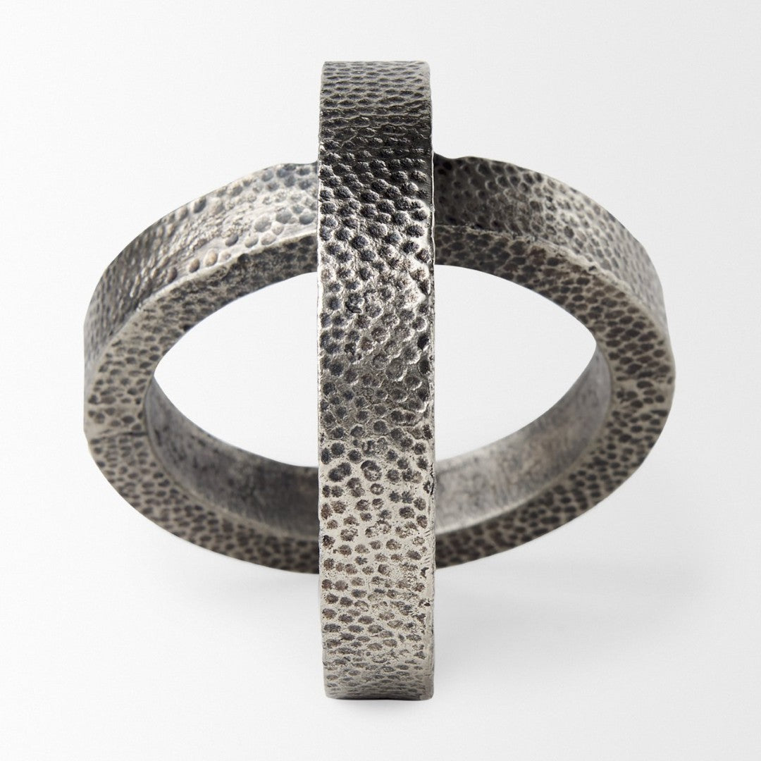Celebrate enduring bonds with the Rafiki — a sculptural accent piece that blends modern design with warm sentiment. Crafted from solid metal with a distinctive blackened-silver hammered finish, the two conjoined circles evoke unity and friendship while adding tactile texture and visual interest to mantels, shelves, or tabletops. Versatile and thoughtfully balanced, this piece can be displayed at multiple angles to suit your space and styling needs.