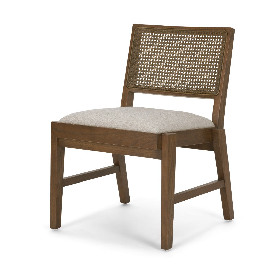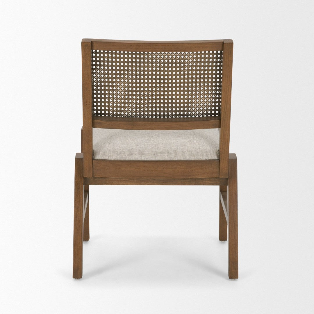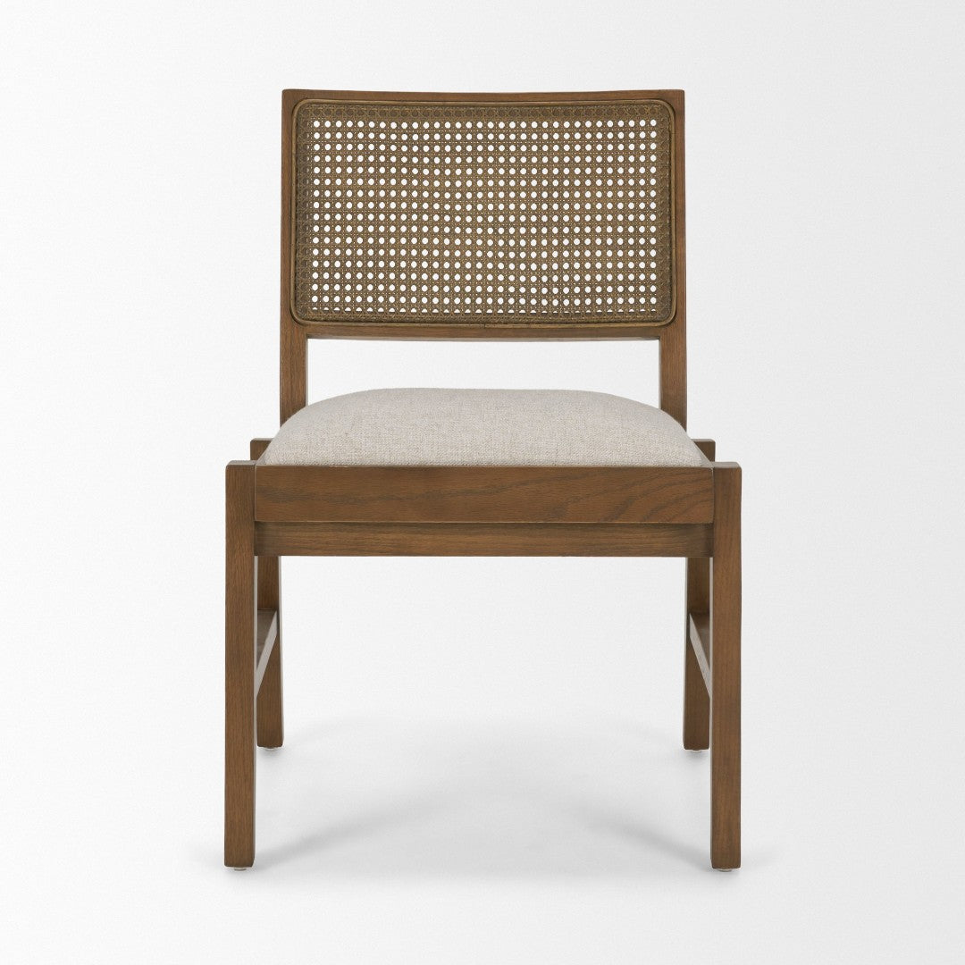 Elevate your dining space with a chair that marries mid-century refinement and modern comfort. The Reid dining chair features a warm solid oak frame and handwoven cane detailing that bring natural texture and timeless appeal, while its plush, cream linen-blend seat provides supportive comfort for everyday meals and gatherings.