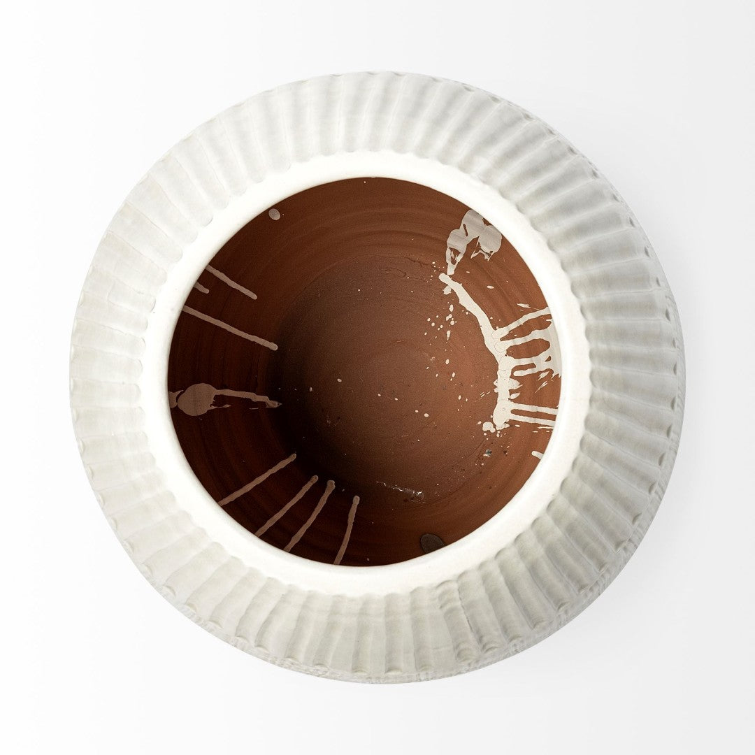 - The Reyan is finished in a pearl white glaze with a raised striped pattern on the exterior, making it a stunning vase that is sure to turn heads.