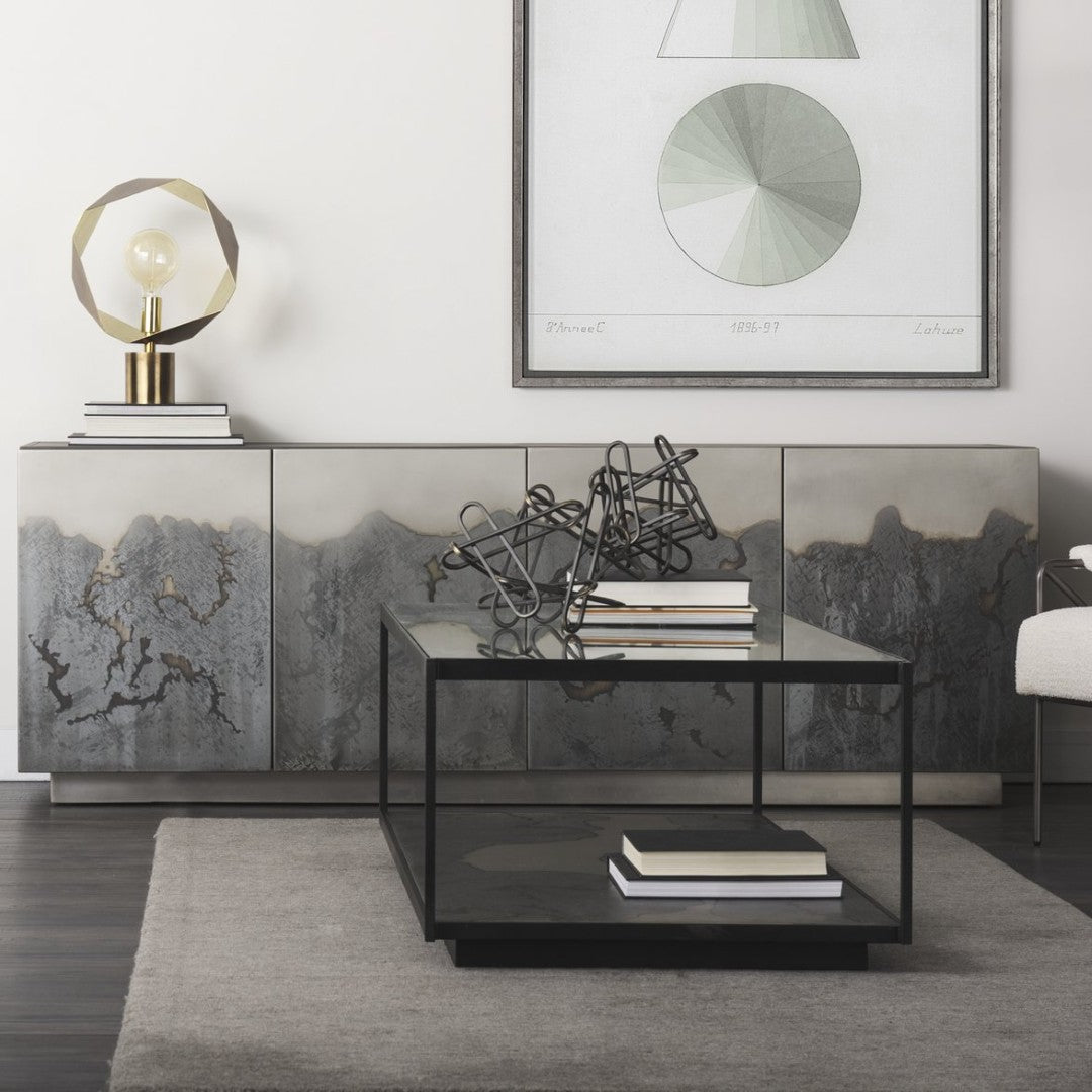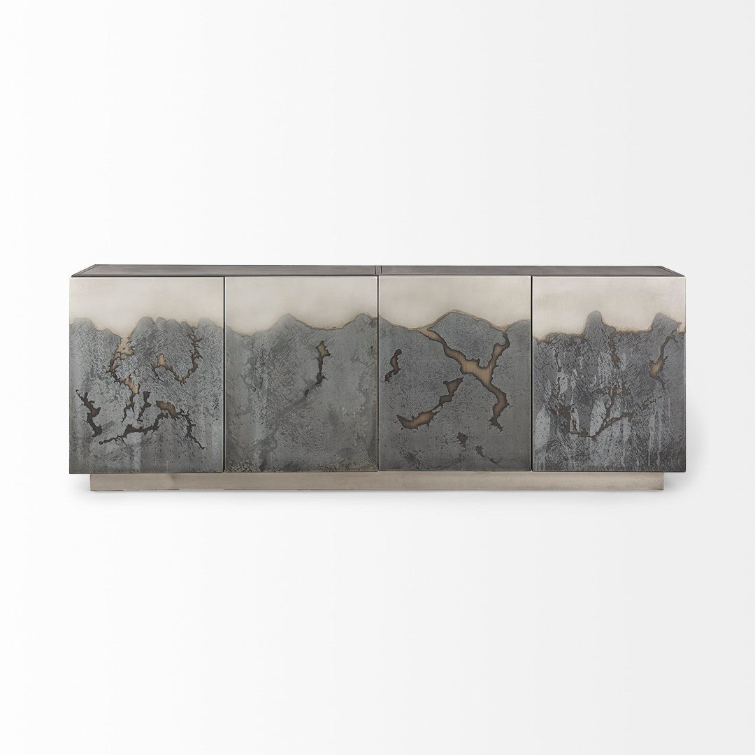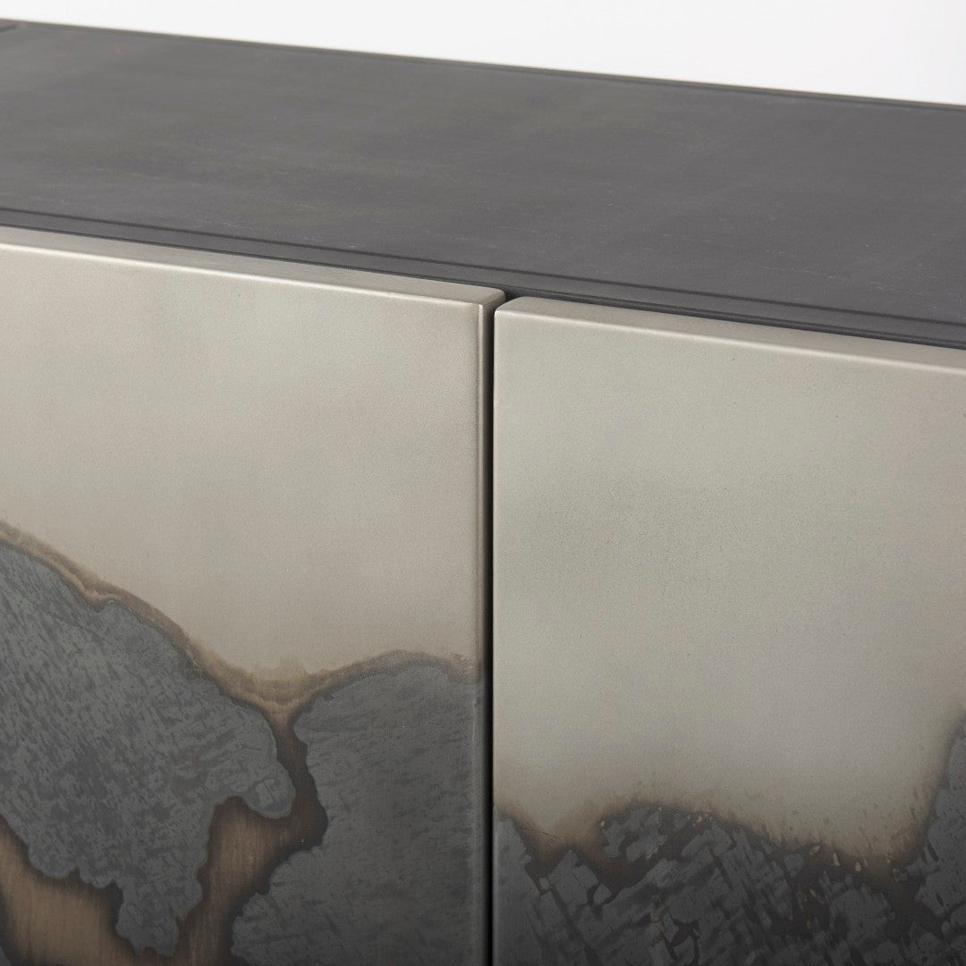 Elevate your industrial or modern interior with this distinctive all-iron sideboard, where durable construction meets artisan detailing. The hand-applied acid wash finish creates subtle variations in tone and texture, so every Roxdale sideboard is a one-of-a-kind statement piece that combines sculptural presence with practical storage.