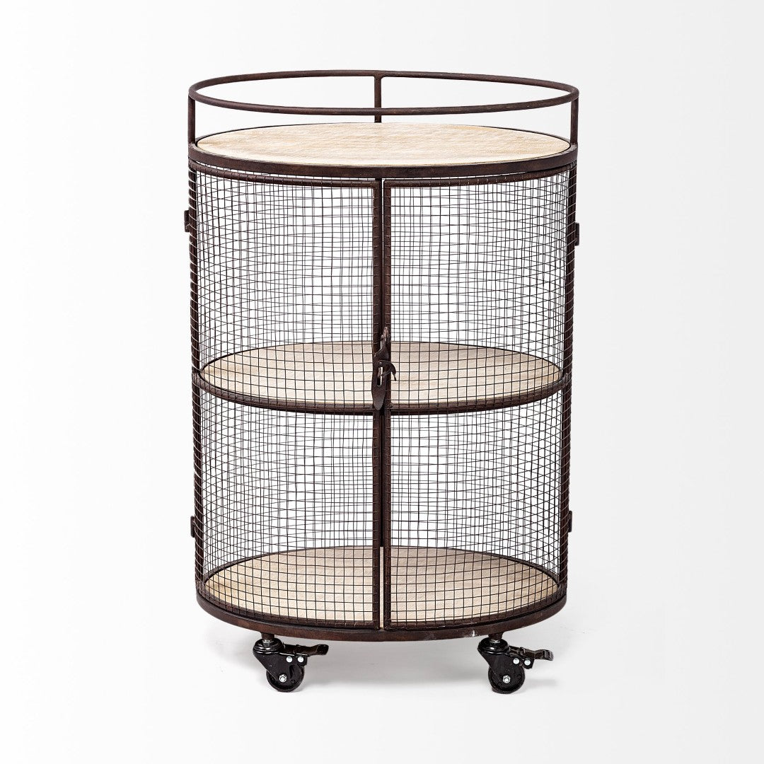 Bring a striking blend of mid-century modern and industrial charm to your home with this oval-shaped metal and wood bar cart. The Saluti II pairs warm wood shelves with a matte black metal frame and mesh doors for a vintage, urban-loft look that’s both functional and decorative. Roll it into place on locking casters for entertaining or everyday storage—delivered pre-assembled and ready to impress.