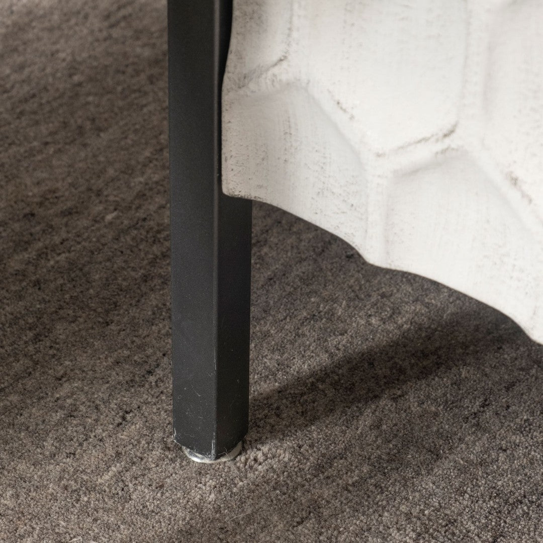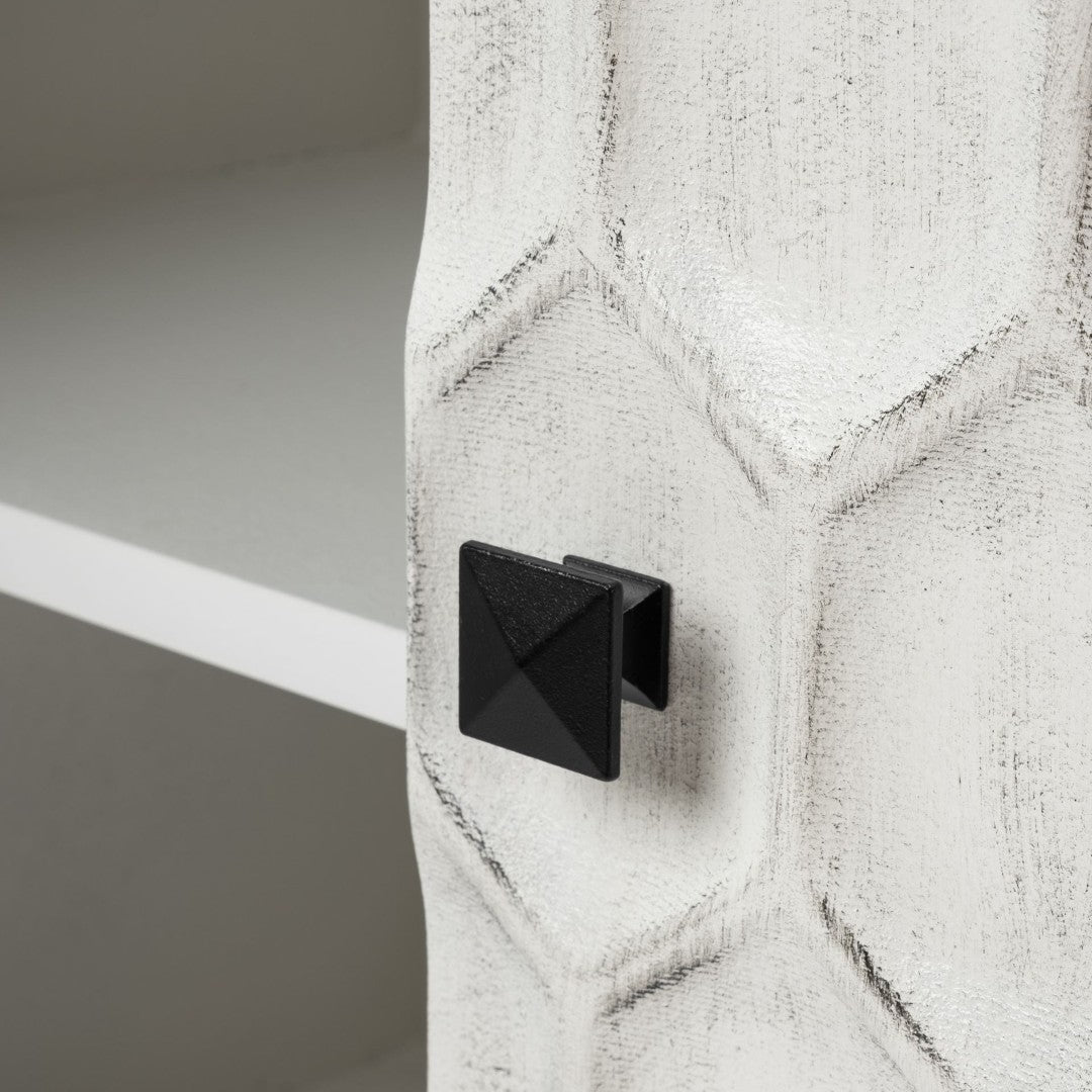 - Finish & Style: Rustic white finish on the cabinet face with hexagonal embossed detailing; Relaxed Modern / Modern / Contemporary design