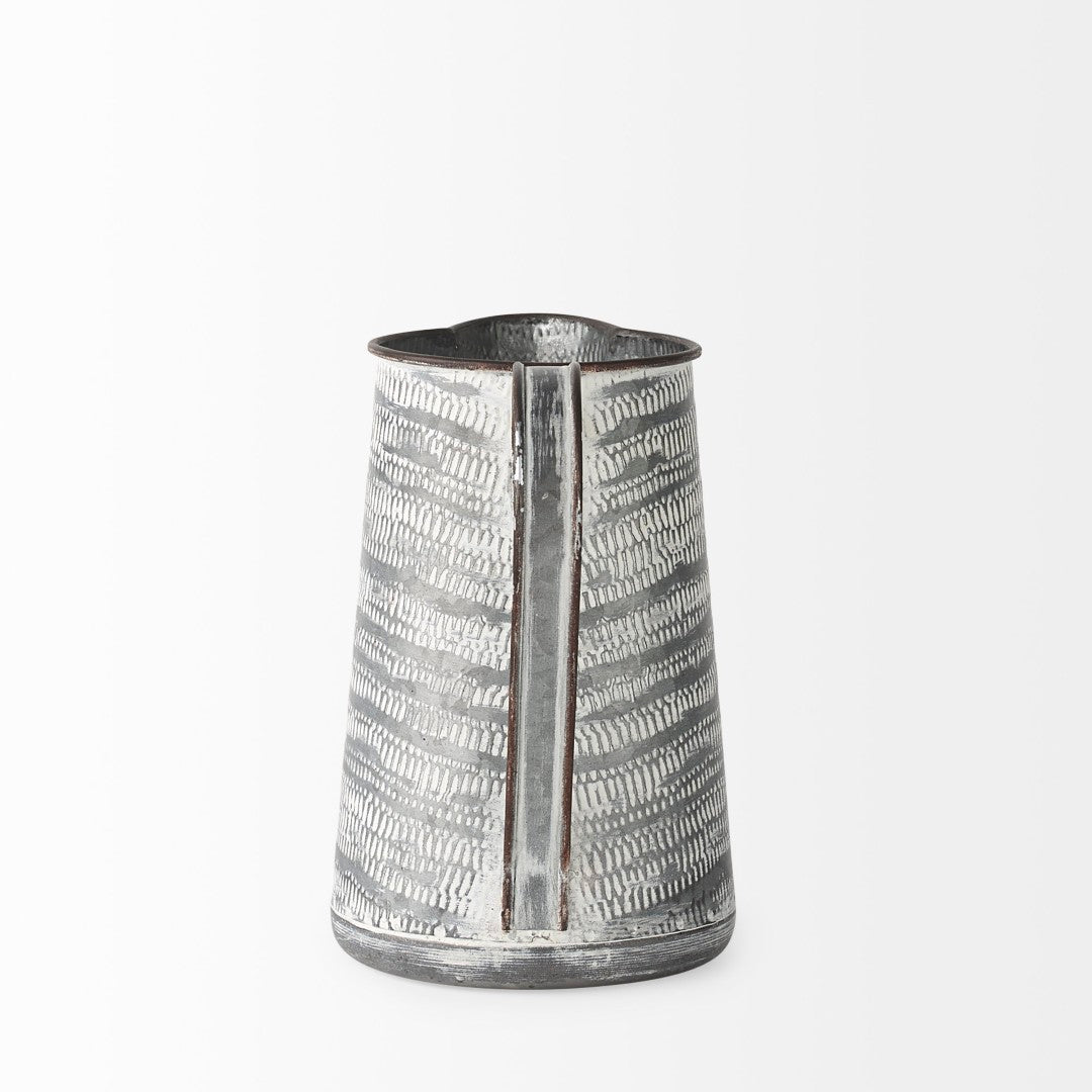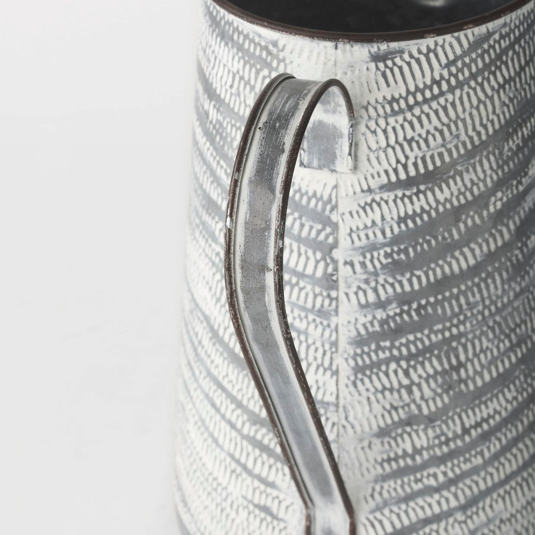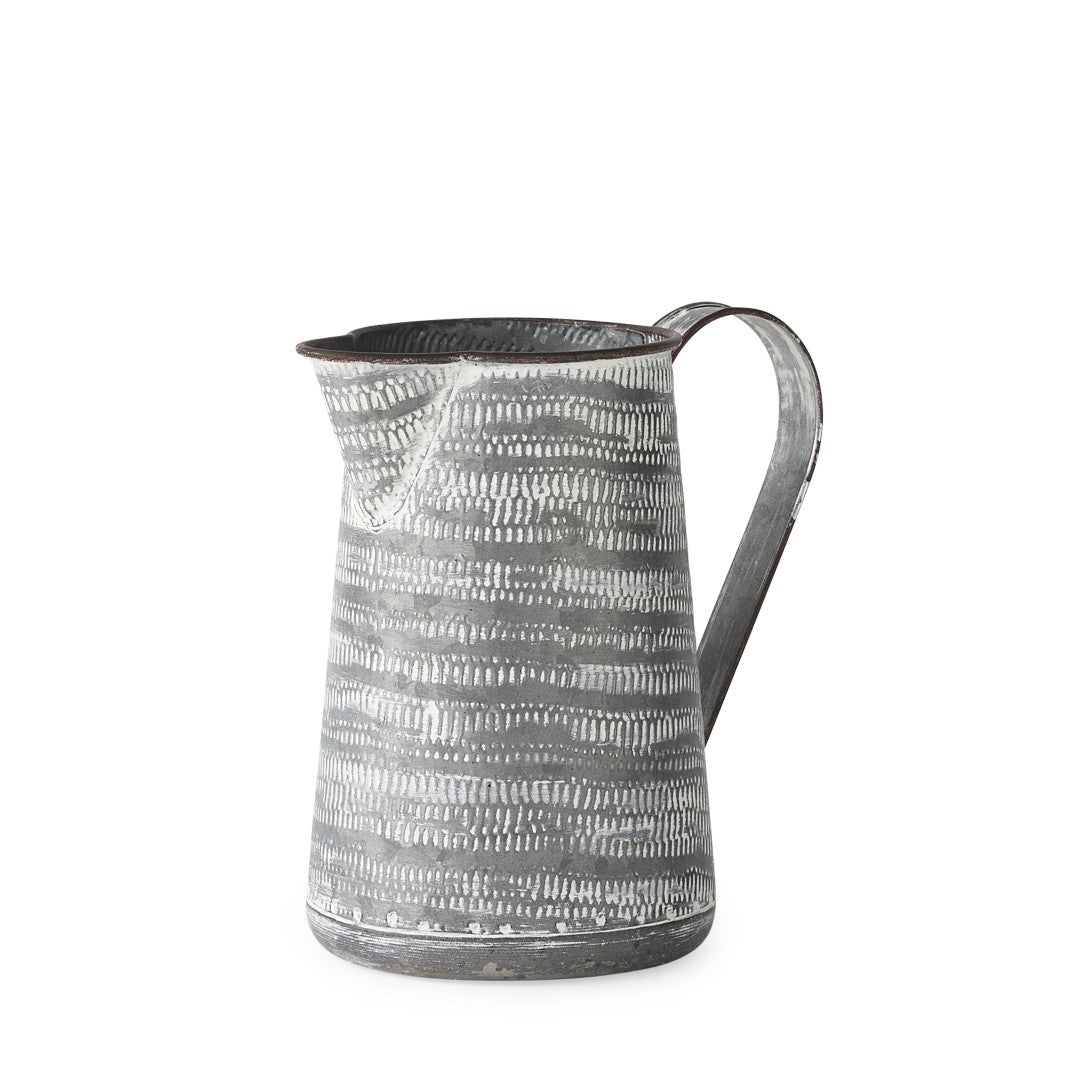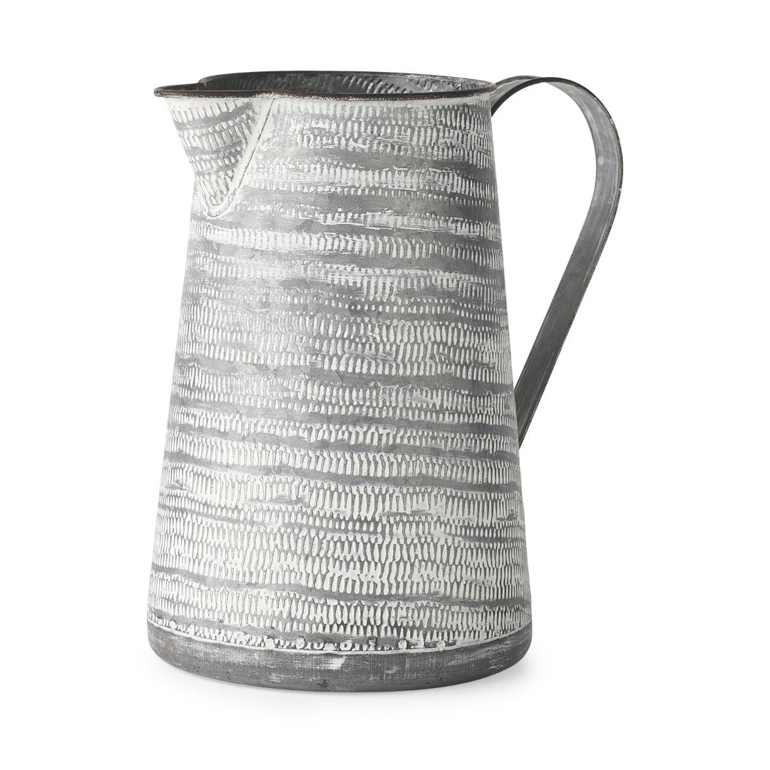 Add rustic charm and modern texture to any room with this decorative metal jug. The Serena-series pitcher pairs a tactile patterned body with a functional pour spout and sturdy metal handle, making it equally suited for tabletop styling, mantel displays, or as a standalone accent piece. Its neutral gray-and-white finish complements a wide range of interiors from farmhouse to contemporary.