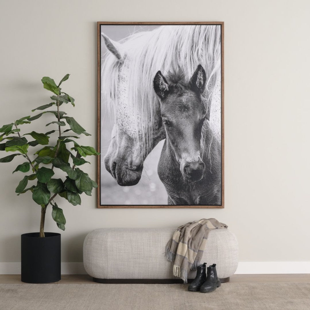 - The gray blend boucle fabric coupled with its dark brown base create a visually enticing contemporary aesthetic.