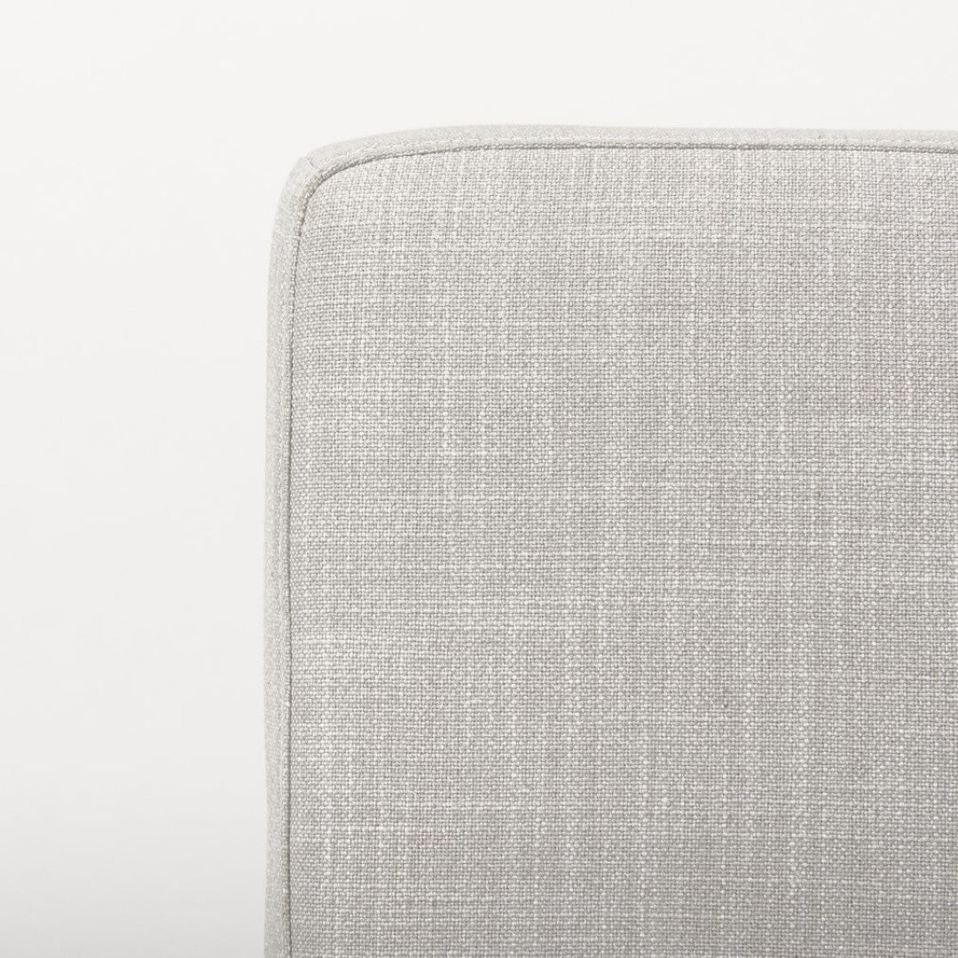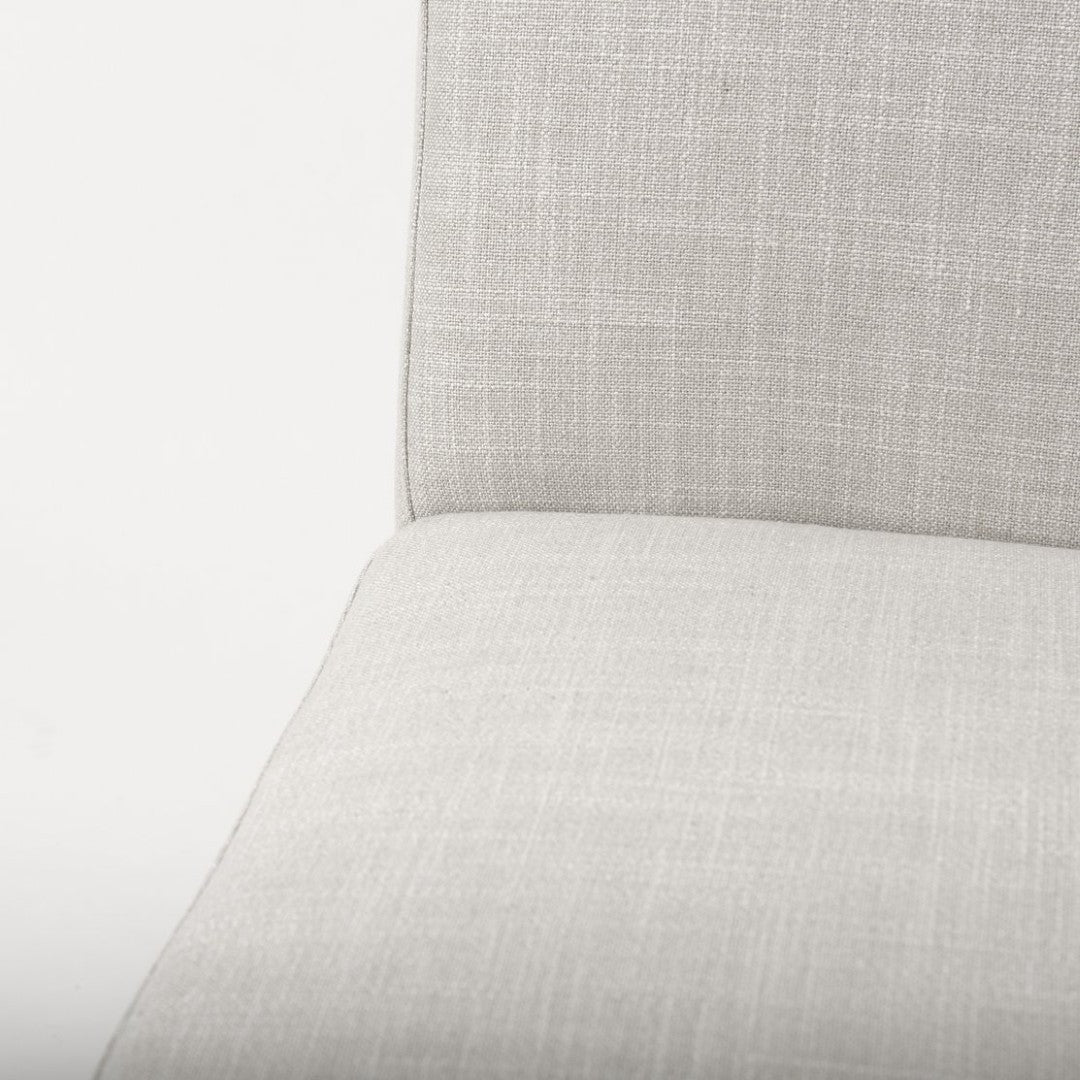 - Beige linen-blend upholstery offers a soft, textured feel with enduring comfort