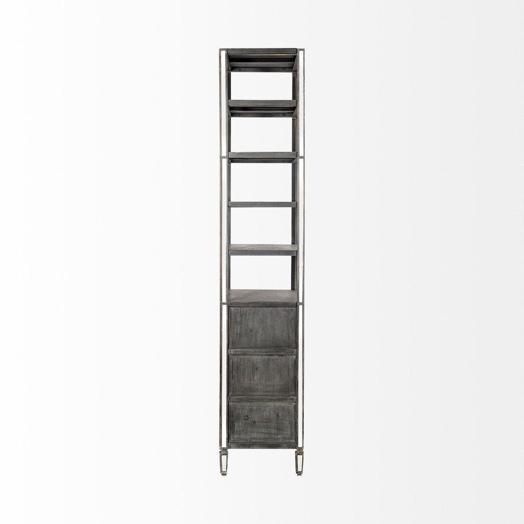 A striking blend of traditional solid wood and contemporary mirrored accents, this vertical shelving unit brings height, storage, and visual interest to entryways, living rooms, or bedrooms. Clean lines and reflective inlays create a sophisticated focal point while four spacious shelves and a mirrored-front drawer offer practical organization for decor, books, and essentials.