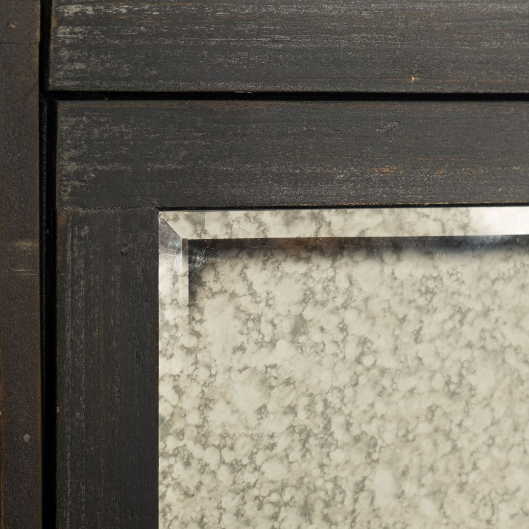 - Decorative mirrored glass inlays on the frame and drawer fronts add depth and a contemporary touch