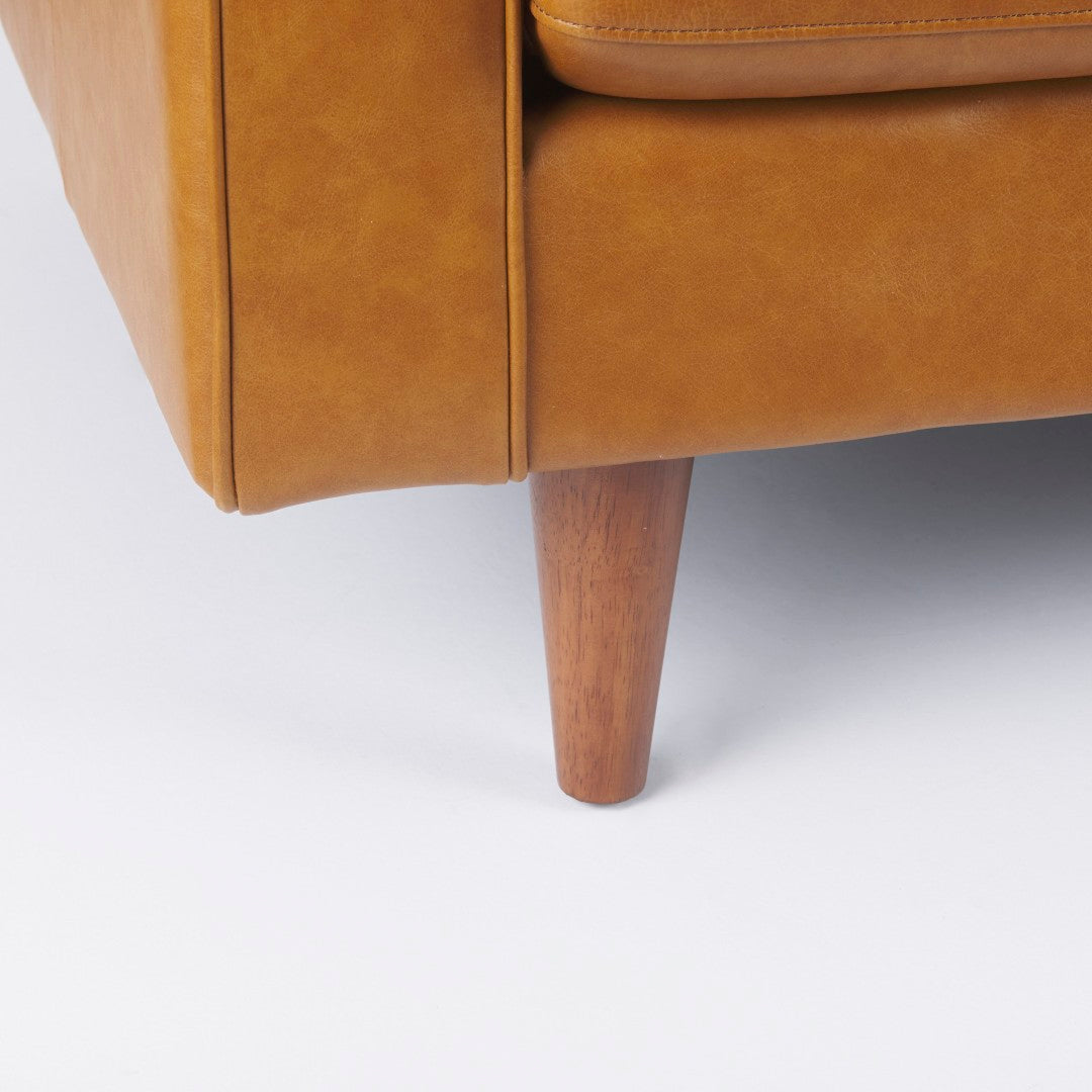 - Upholstery: Full-aniline 100% top-grain genuine leather in a rich tan finish; natural color variations and creases are expected and contribute to a unique, developing patina.