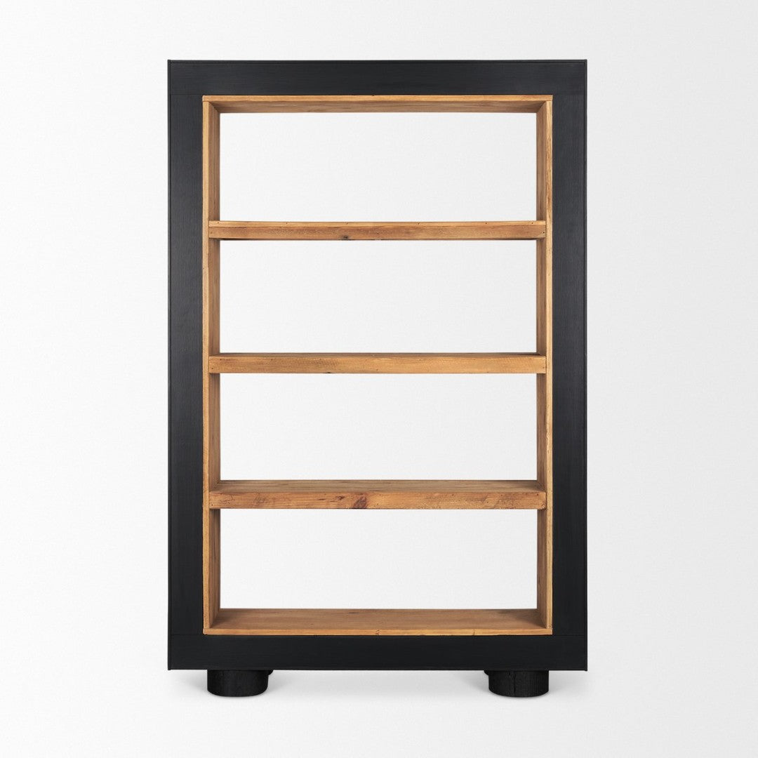 Bring rustic warmth and modern edge to any room with this thoughtfully crafted bookcase. Made from solid recycled pine and accented by a smooth black oak veneer waterfall frame, it pairs reclaimed character with contemporary lines for a durable, eye-catching storage solution that elevates living rooms, home offices, or entryways.