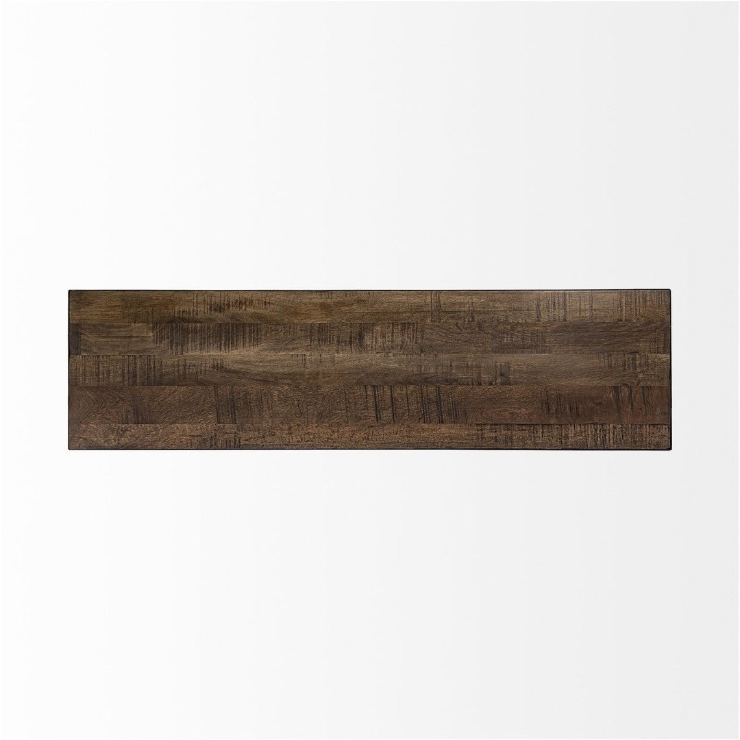 - The Trestman III features a stunning, rectangular medium-brown polished top crafted from premium Indian mango wood and a matte-black polished iron base that is sure to make this bench a head-turner in your space.