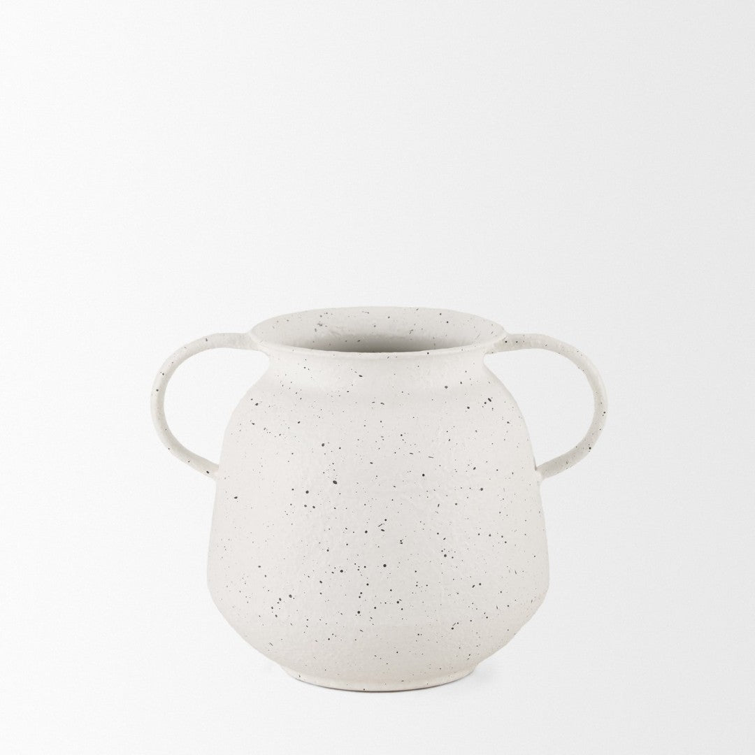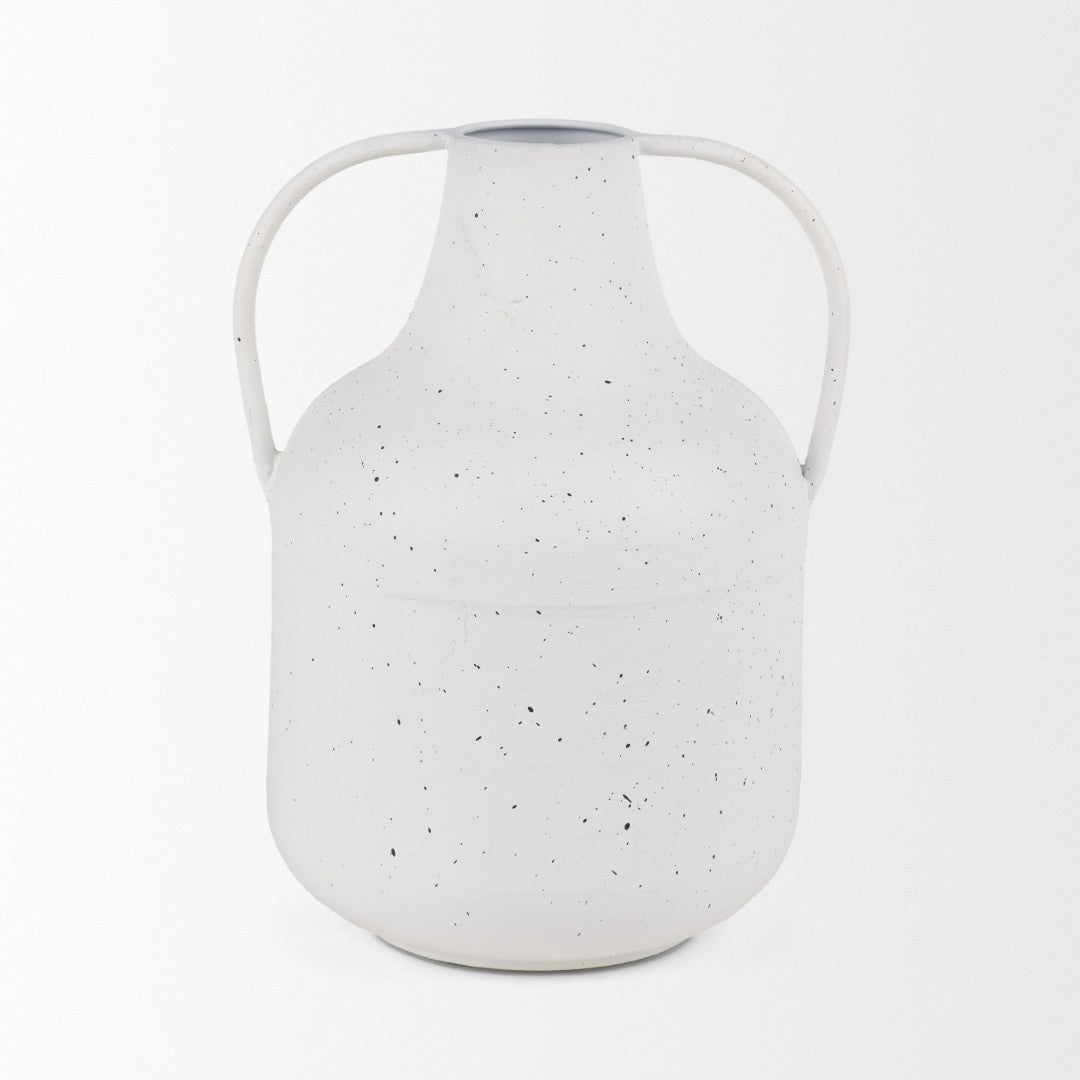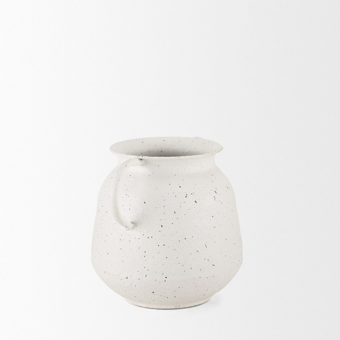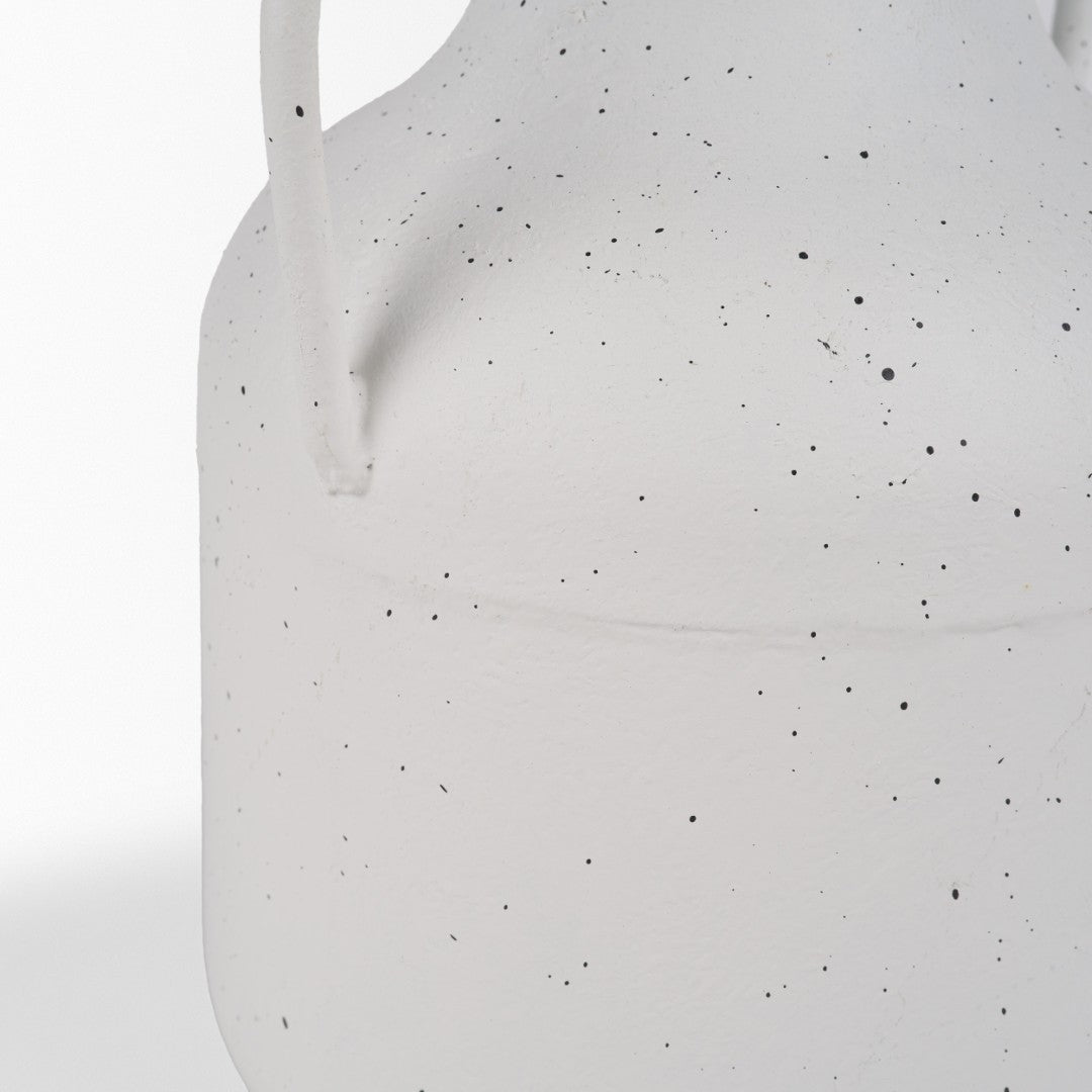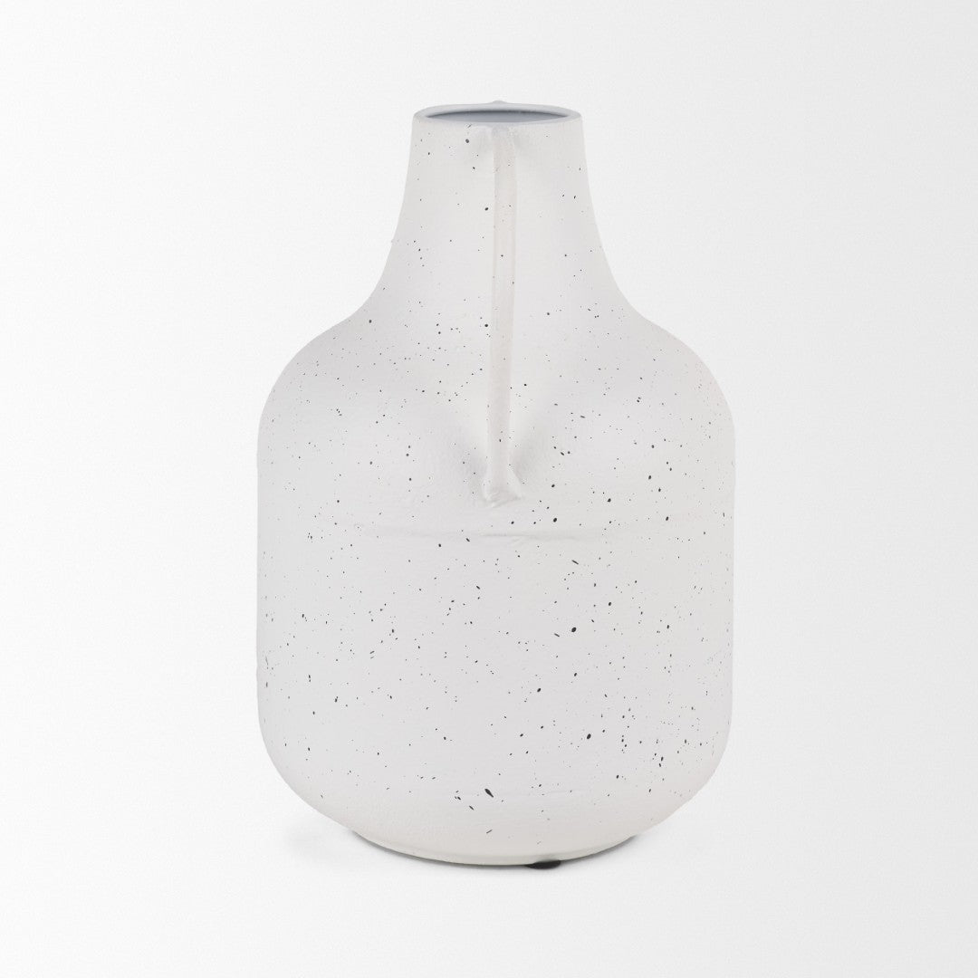 Bring understated rustic charm to any shelf or tabletop with this compact metal vase. Its matte white finish, subtle black speckling, and textured surface create visual interest while remaining versatile enough for minimalist, farmhouse, or contemporary interiors. Designed for dried or artificial florals, the Treva vase makes an elegant accent on its own or as part of a grouped display.