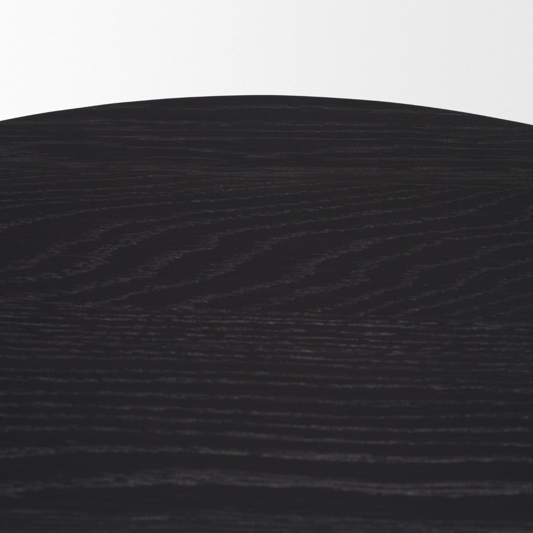 - Top Finish: Smooth round black oak veneer tabletop that provides a modern contrast to the rustic base