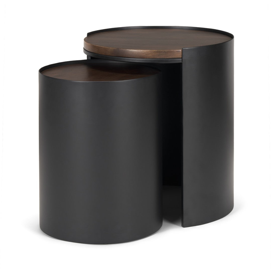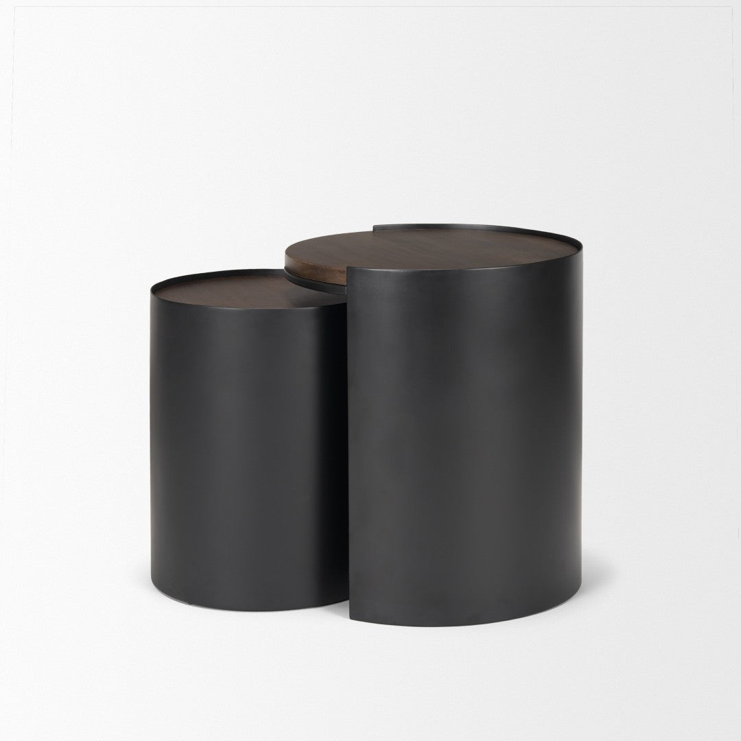 Add contemporary flair and versatile function to your living space with this pair of nesting accent tables. Designed for style and practicality, the contrasting matte black metal frames and warm dark brown wood tops create a modern, sculptural look that works as a coordinated set or as two separate accent pieces to flank seating, display décor, or hold drinks and lamps.