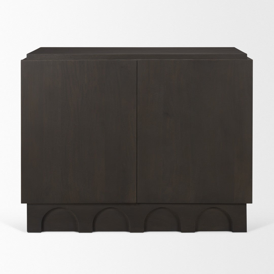 Elevate your living space with the Wagner Accent Cabinet — a beautifully crafted storage piece that blends timeless design with sturdy construction. Made from solid mango wood and finished in a rich dark brown stain, this cabinet adds warmth and sculptural interest with its scalloped arched cutouts on the recessed base and matching arched detailing on the cabinet doors. Ideal for use in entryways, living rooms, or dining areas, the Wagner provides both functional storage and refined decorative appeal.