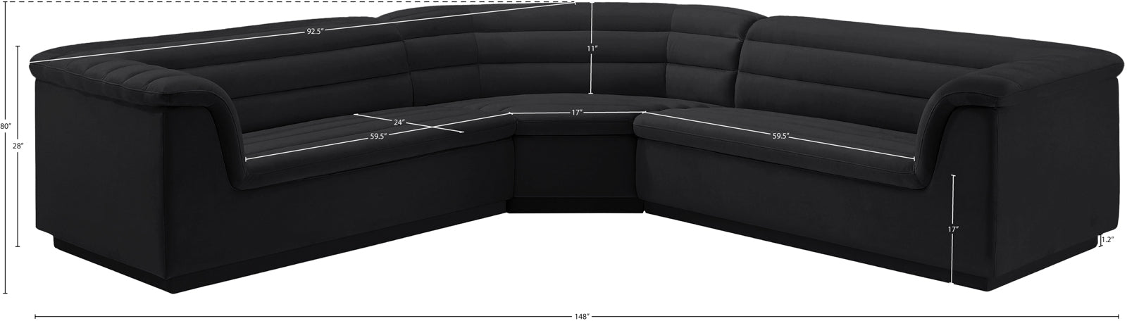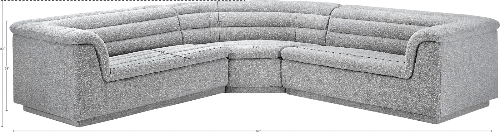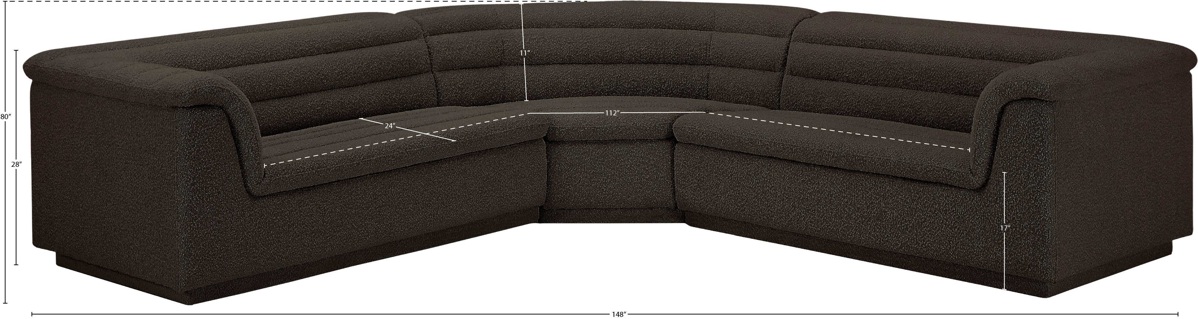 - Dimensions: 193Black-Sectional Cascade Black Boucle Fabric Modular Sectional - 148" W x 80" D x 28" H