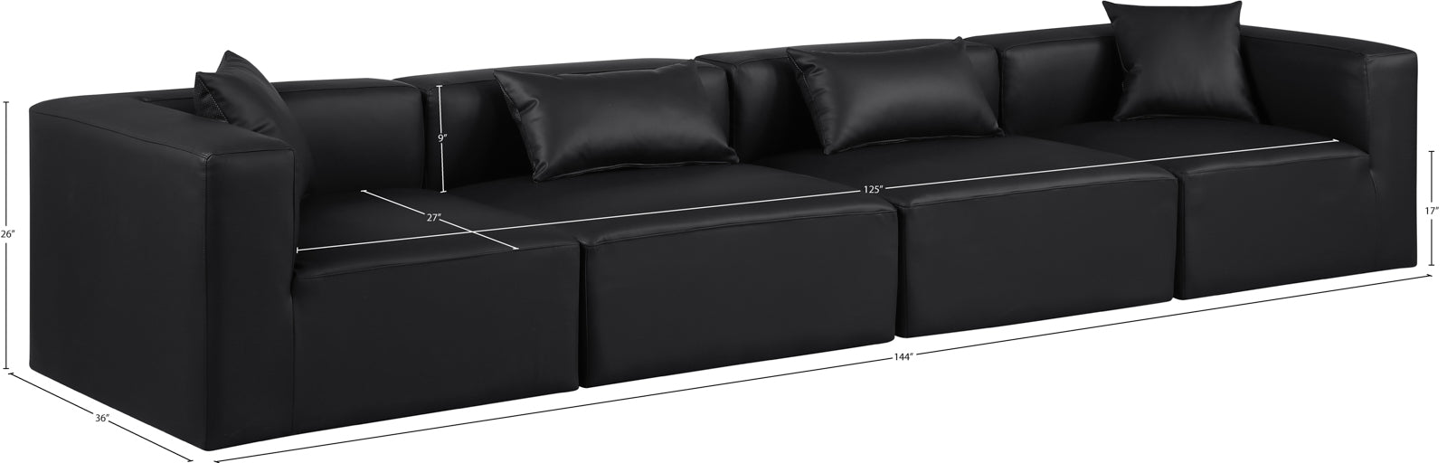 - Dimensions: 668Black-S144B Cube Black Vegan Leather Modular Sofa - 144" W x 36" D x 26" H