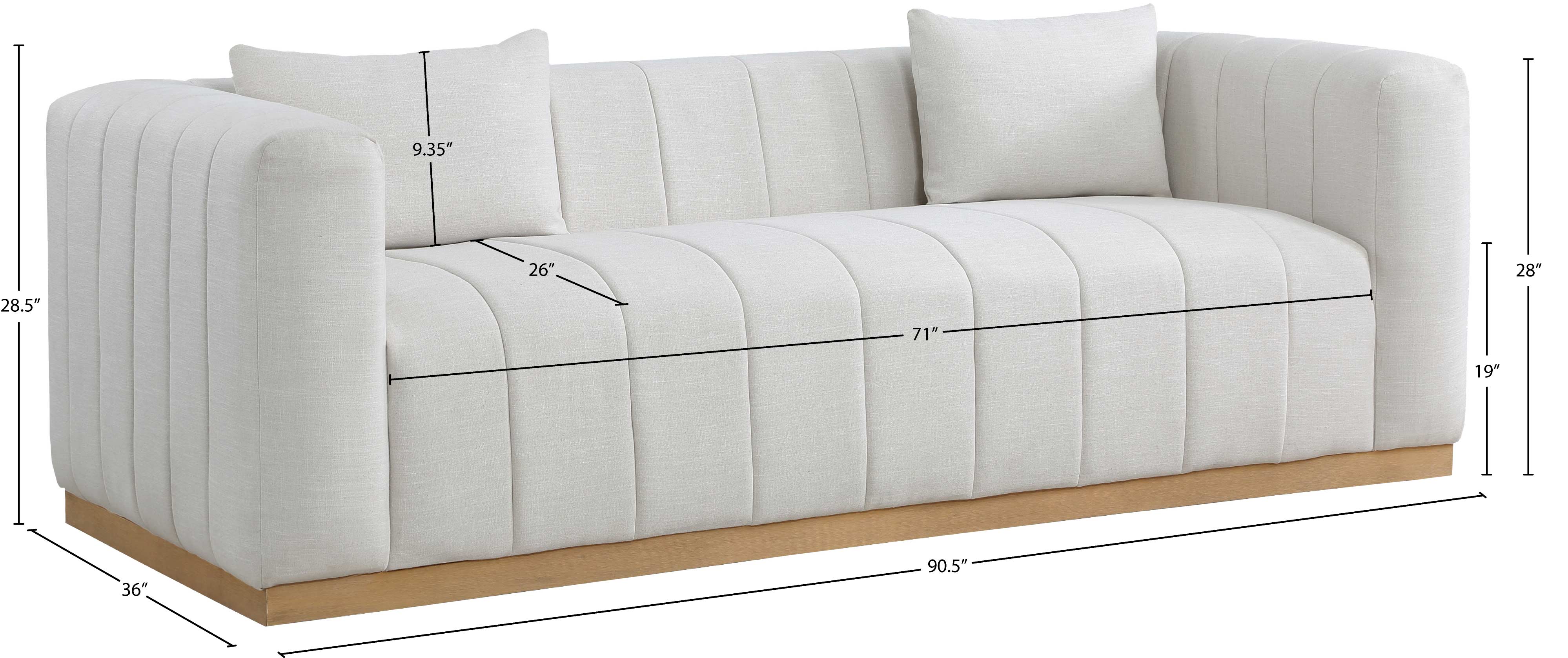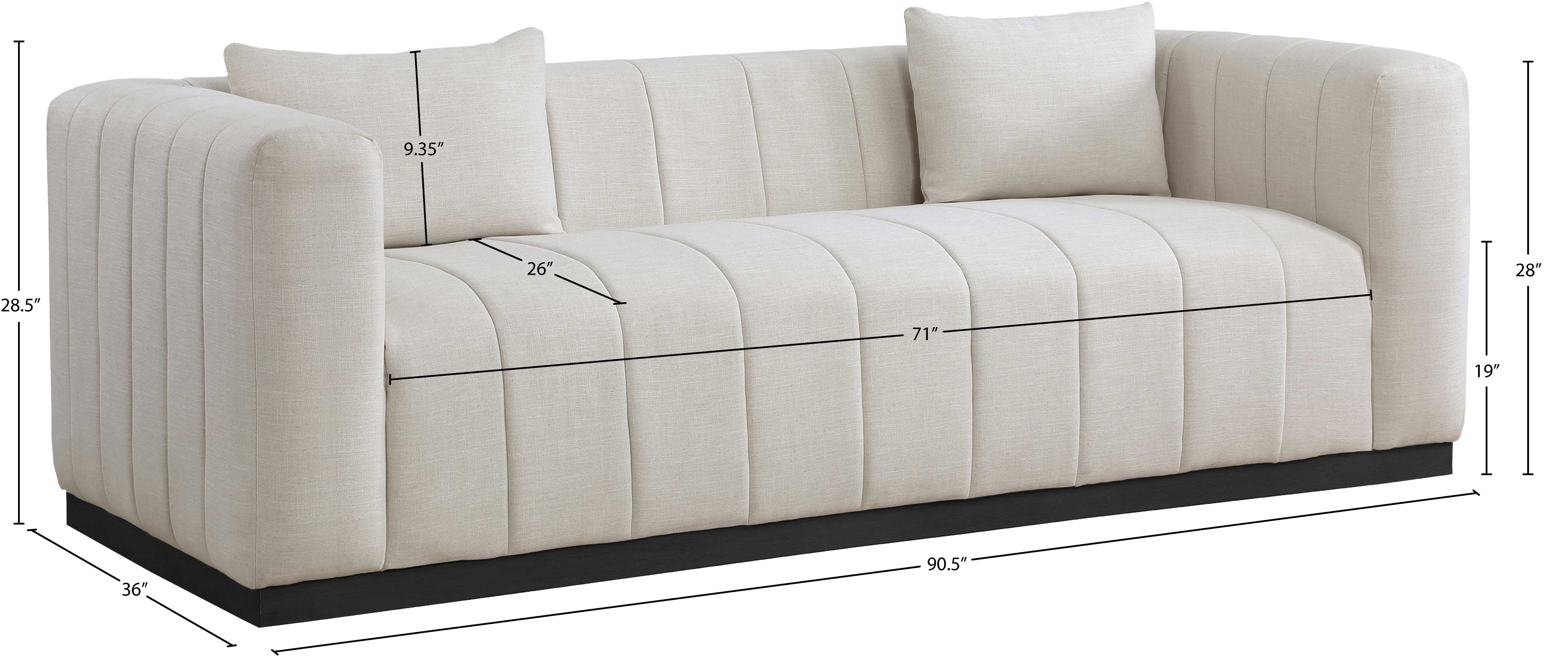 - Dimensions: 655Beige-S Lucia Beige Linen Textured Fabric Sofa - 90.5" W x 36" D x 28.5" H