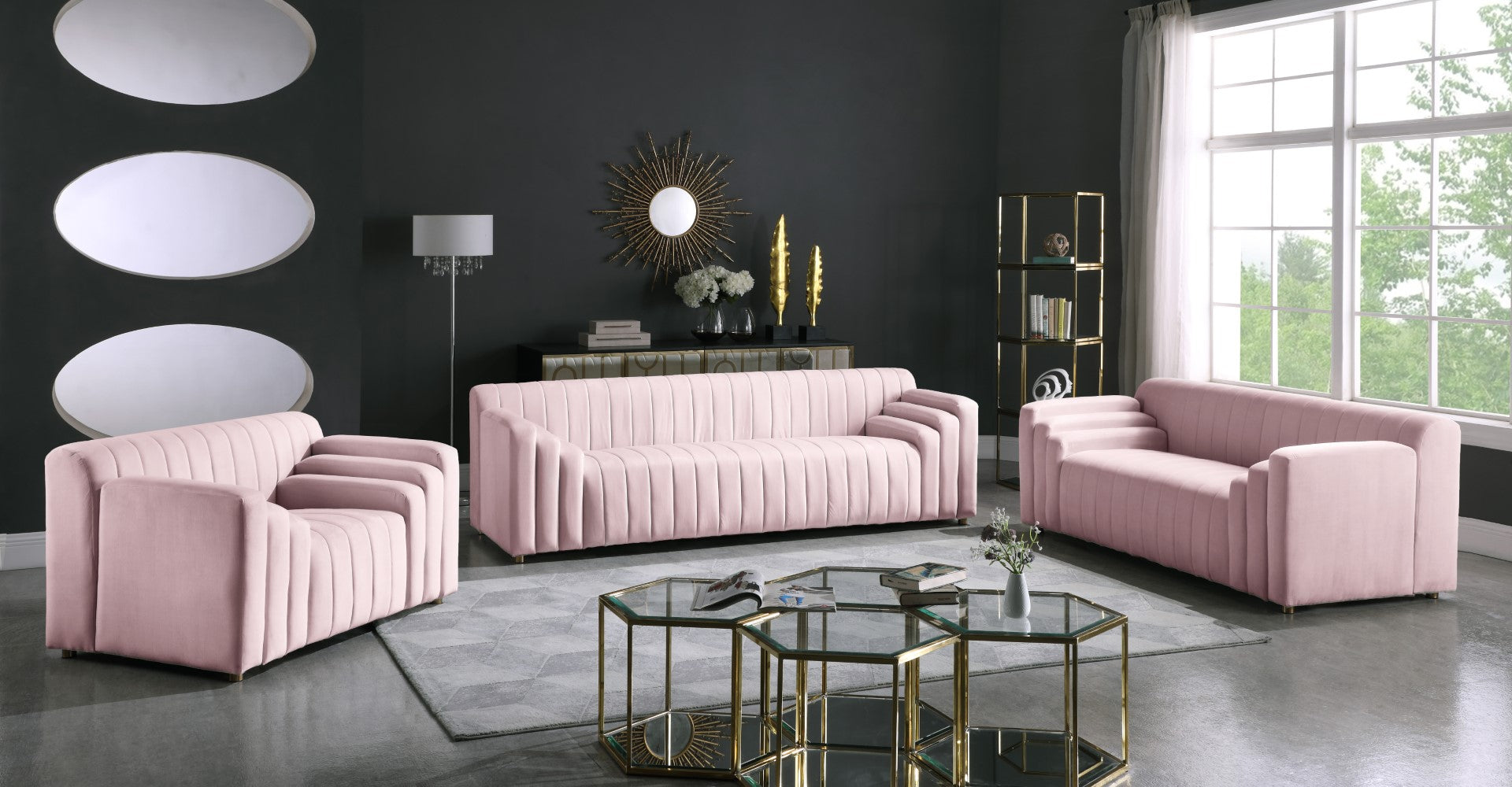 - Material: Velvet / Engineered Wood / Metal / Foam