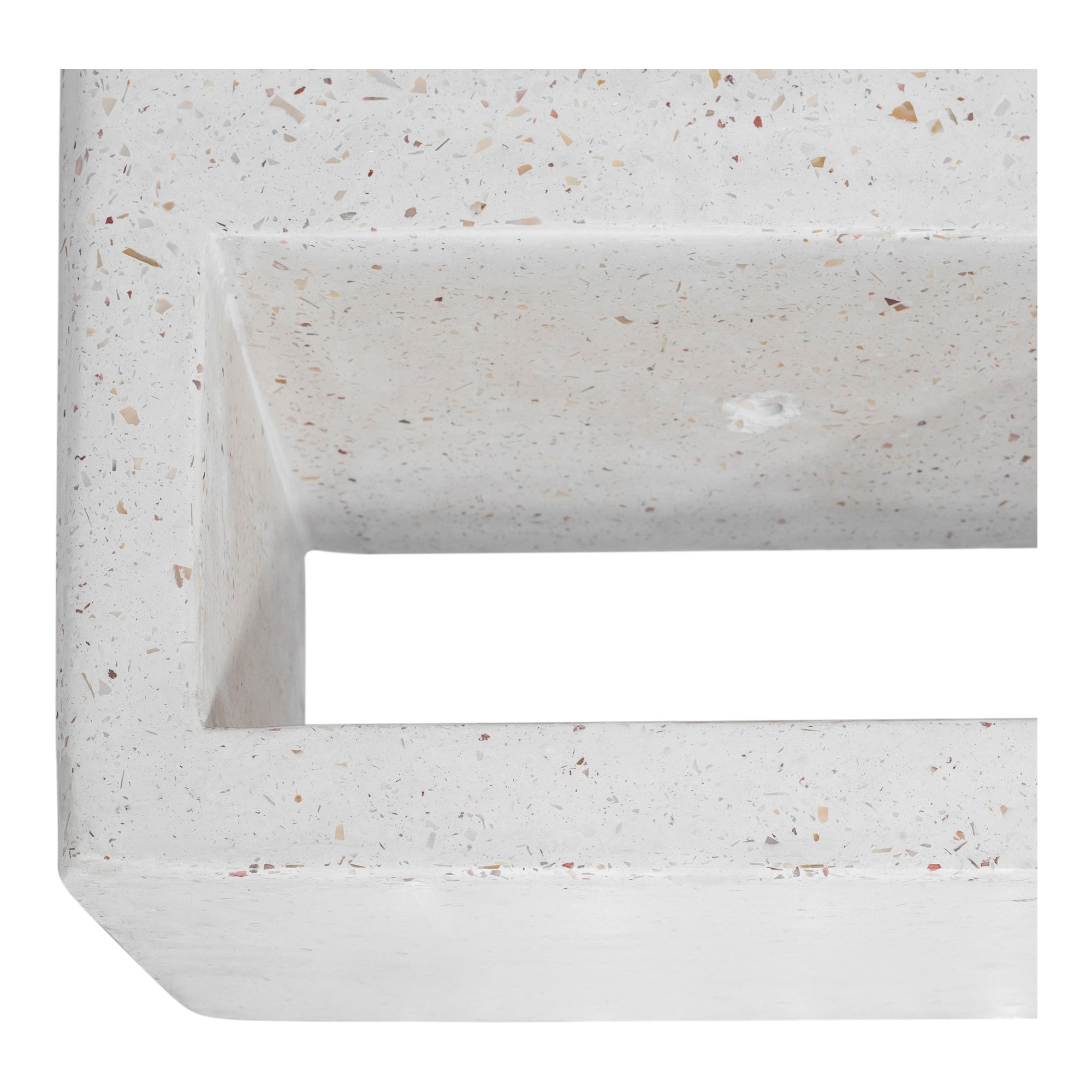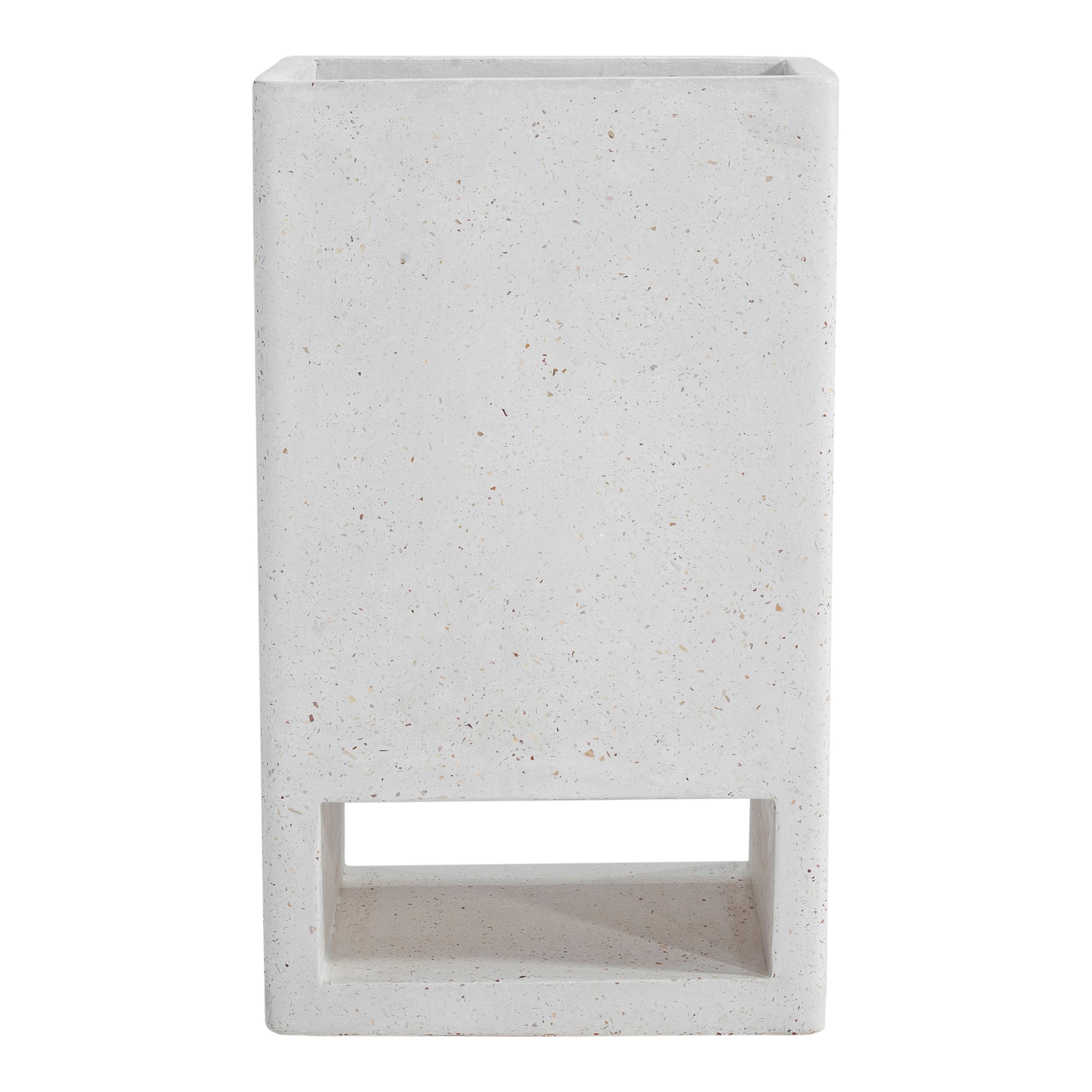 A sculptural planter to blend in seamlessly with your outdoor setting. An eye-catching base cutout and tall rectangular form are fused in an ivory mineral-effect terrazzo that adds a sense of intrigue to this outdoor statement design. Use as a standalone or in pairs for a contemporary, symmetrical display in two soothing colors in a matte finish.