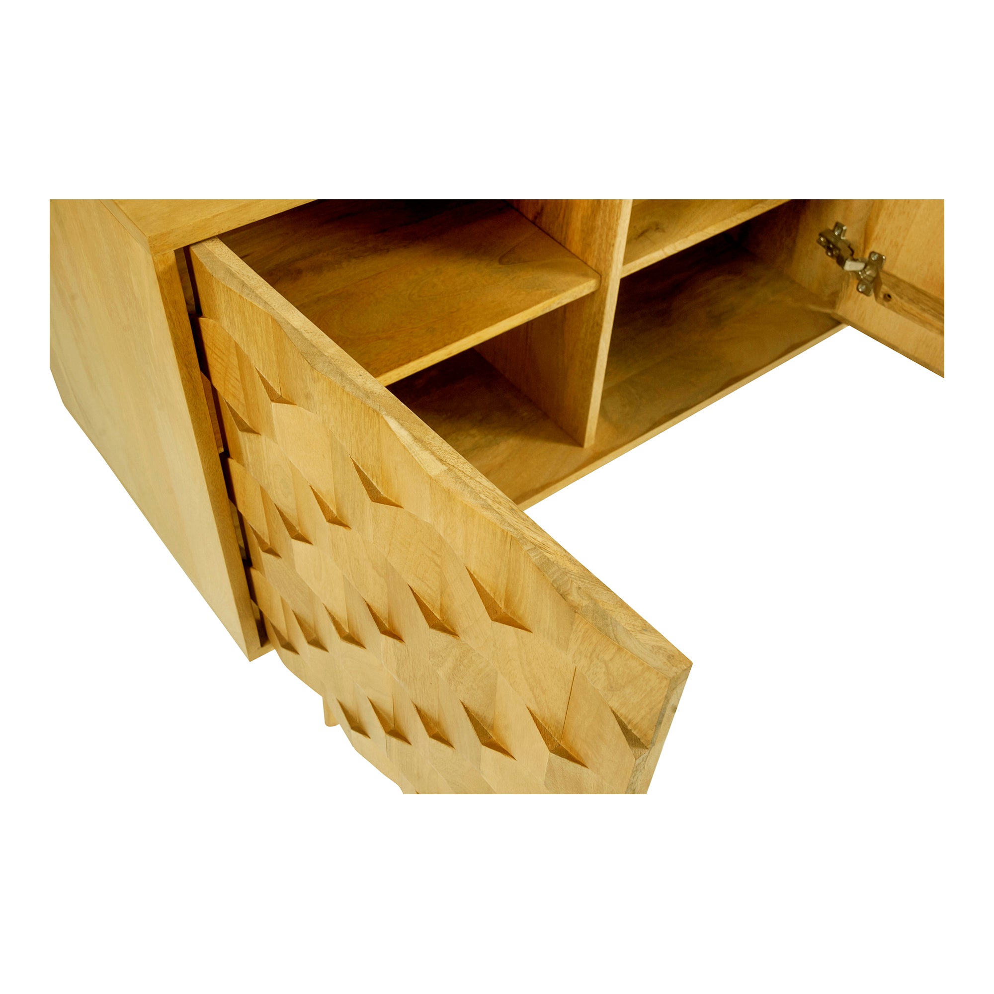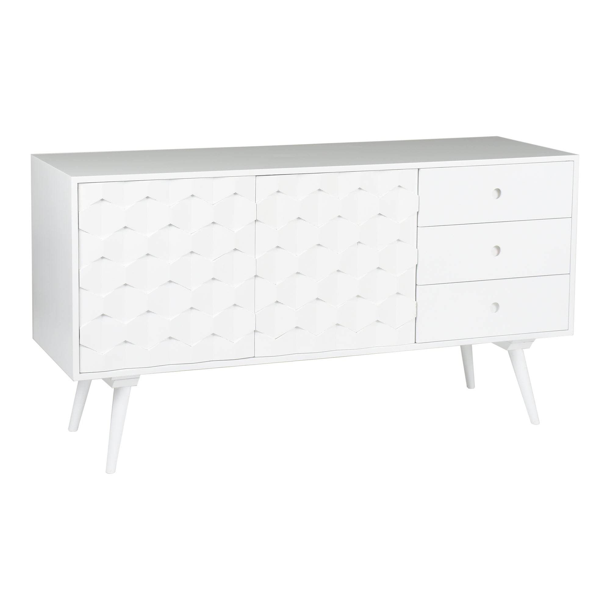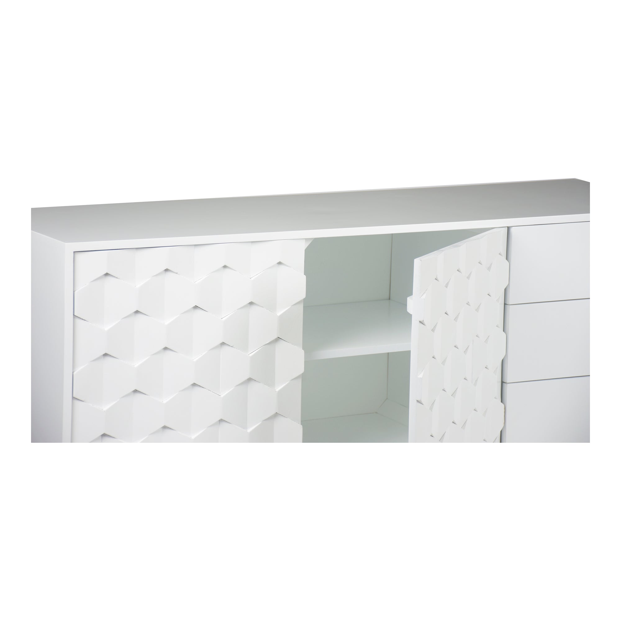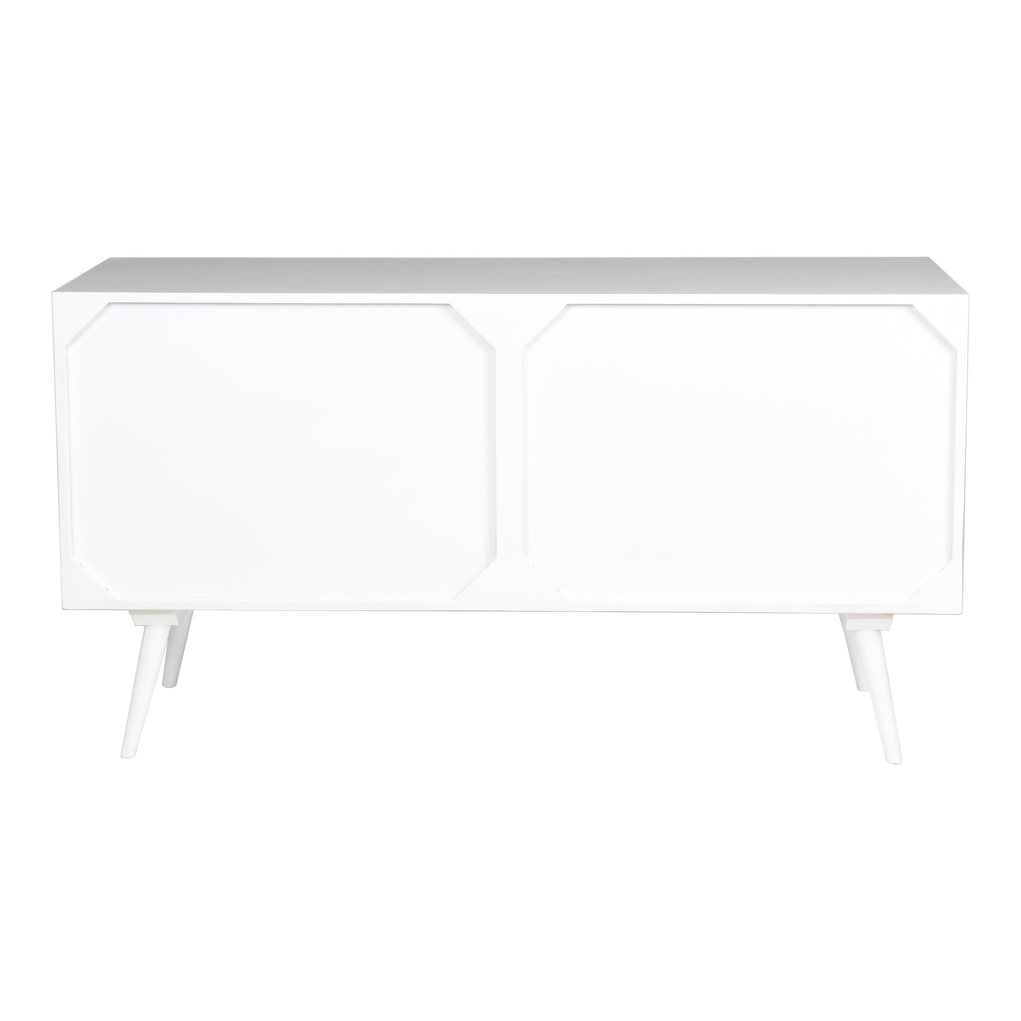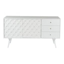 Retro-inspired with a modern twist. Beautifully constructed and with plenty of storage, the O2 sideboard stands bold in any dining area as the new home for all your dining accessories. A sleek white finish and intricate façade provide both character and convenience, while its thin pencil-styled legs add an elegant touch. With two cabinets and three easy-open drawers, you’ll be saving space while basking in the organic style.
