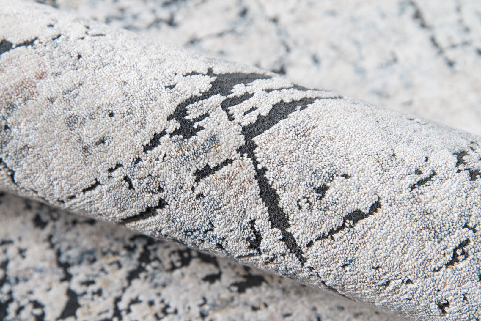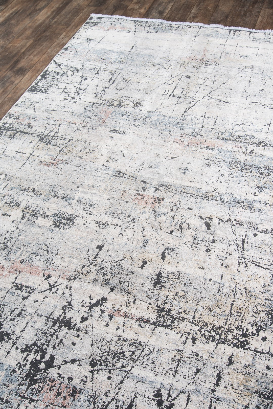 The abstract design of this modern area rug collection is an exuberant expression of tone and texture. Hints of traditional carpet patterns play out beneath splashes of white and bold black striations, artfully crafted in a curated palette of grayscale shades. A blend of silky viscose and polyester fibers invite you to slip into something more comfortable for the floor, their delicate threads and smooth hand shimmering beneath living room light with subtle luster.