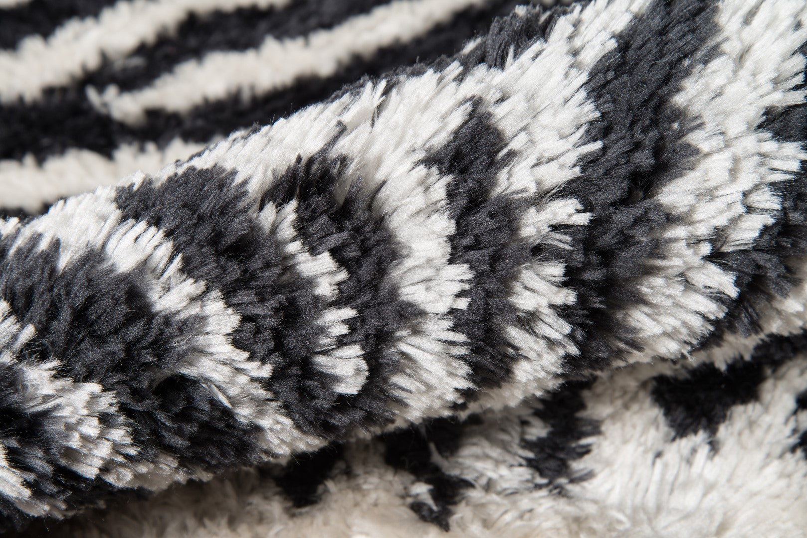 The graphic animal print throughout this modern area rug collection sends interior spaces on urban safari. The exotic series of zebra stripe rugs combines the authenticity of a classic animal skin carpet with sumptuous and sustainably beautiful synthetic fibers. The bold striped pattern and plush fibers feel softer than hair-on-hide leather, while the irregularly shaped silhouette looks wild and wonderful beneath a coffee or dining room table.