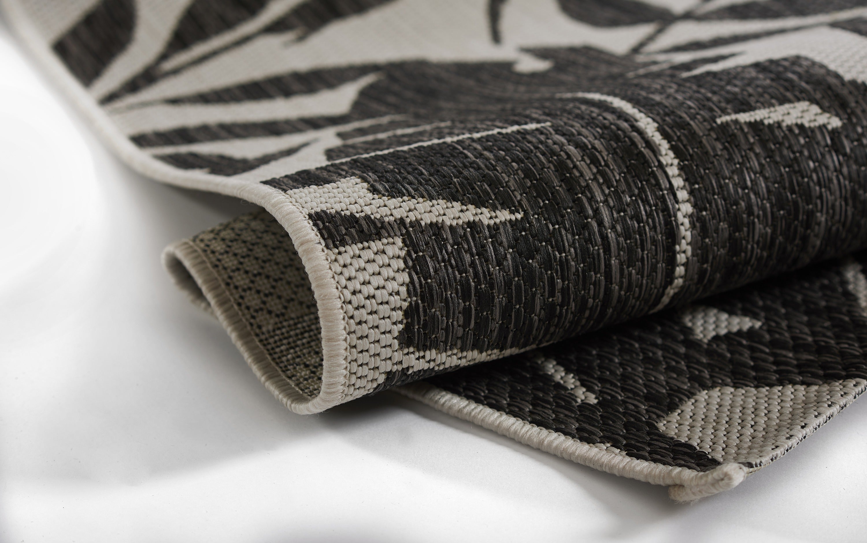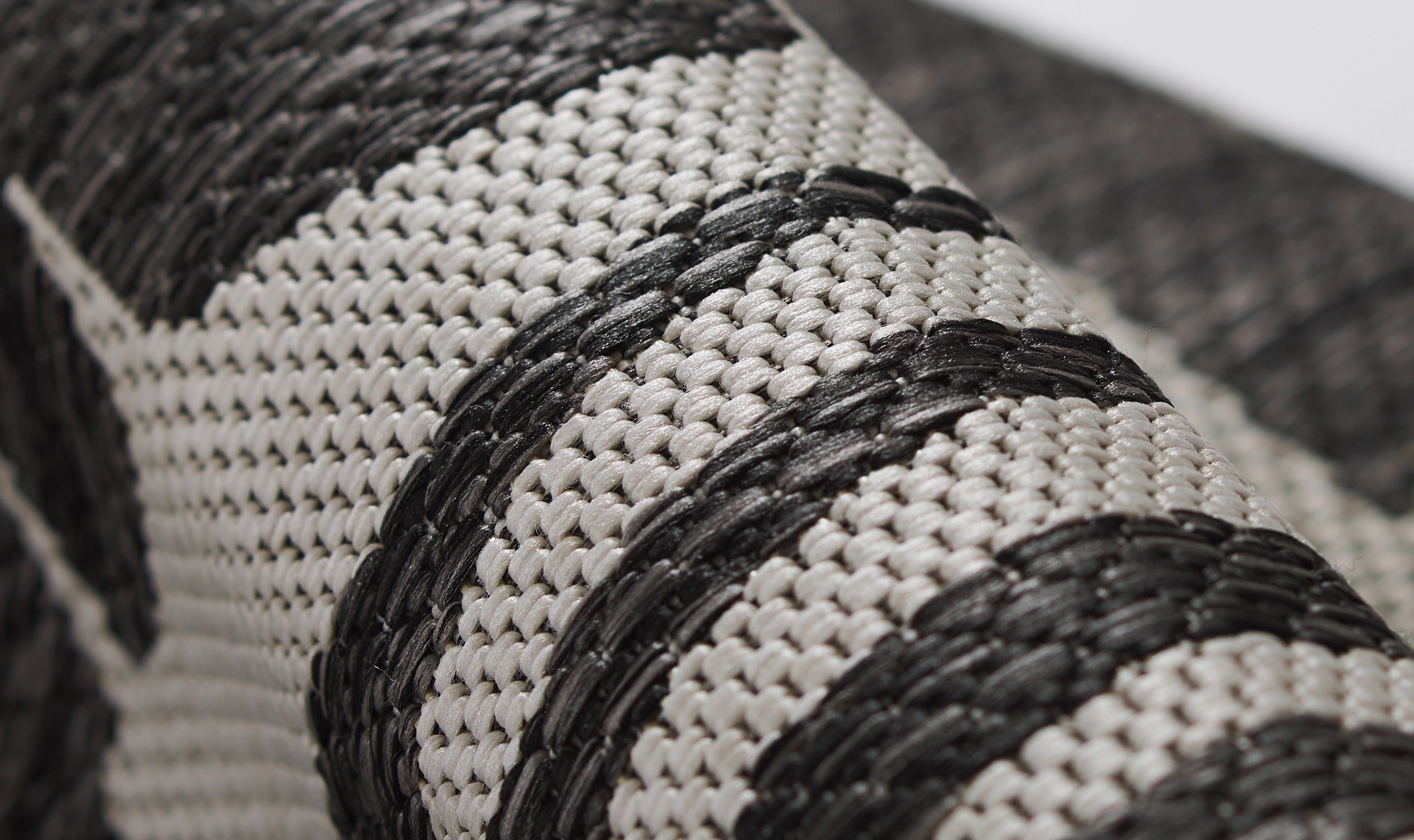 An indoor/outdoor rug assortment that exudes contemporary cool, this modern area rug collection features repetitive patterns inspired by international architectural motifs. The all-weather rug series emphasizes graphic geometric prints, using high contrast charcoal grey, chambray blue, fuchsia pink and russet red shades to draw attention toward the floor. Manufactured from durable polypropylene fibers, the decorative floorcovering series is a staple for statement-making interior and exterior spaces.