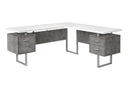 - L-shaped computer desk with 3 storage drawers featuring thick-panel construction and 3 sturdy metal legs in a silver finish