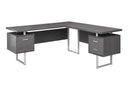 - L-shaped computer desk with 3 storage drawers featuring thick-panel construction in a grey finish and 3 sturdy metal legs in a silver finish