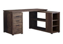 - Fashionable style L shape computer desk with storage, featuring thick-panel construction in a reclaimed wood-look brown laminate finish and includes a 5 year limited warranty for your satisfaction.