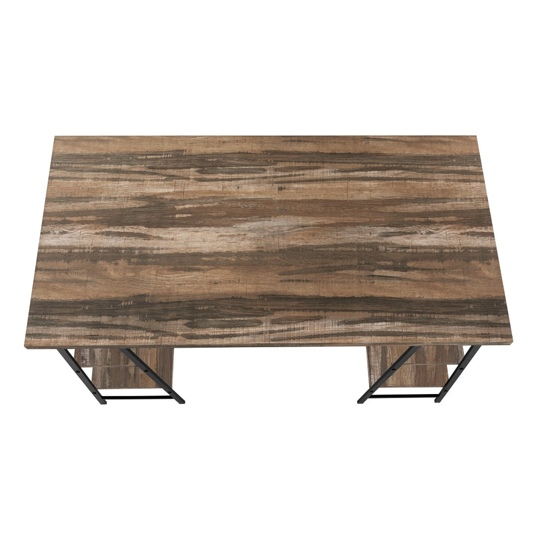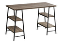 - Industrial-style computer desk with 4 fixed, open shelves supported by sawhorse-style legs in a black metal finish