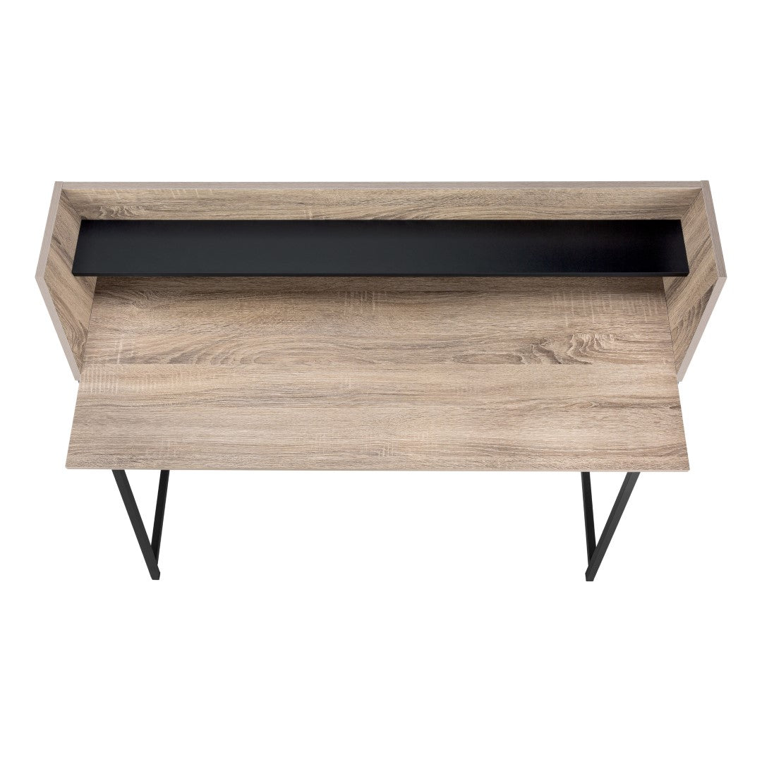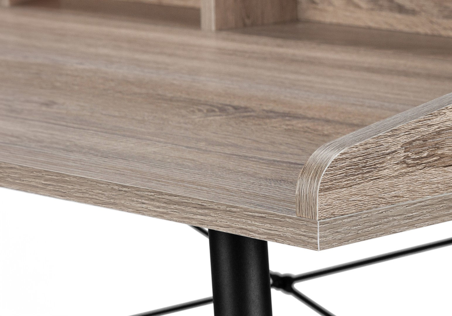 - Thick, rectangular desktop and 4 shelves in 2 different sizes are finished in a dark taupe wood-look laminate with a slight texture