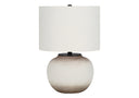 - Illuminate your office, living room, or bedroom with this chic globe shaped 21"h table lamp, with a cream ceramic base with brown shading at the top and bottom for a subtle contrast, and topped with an ivory fabric drum shade and black metal finial for a modern touch.
