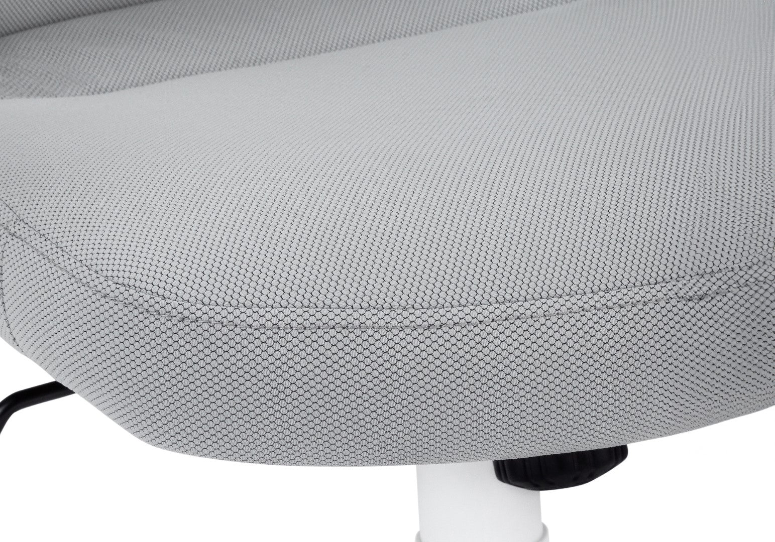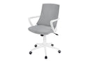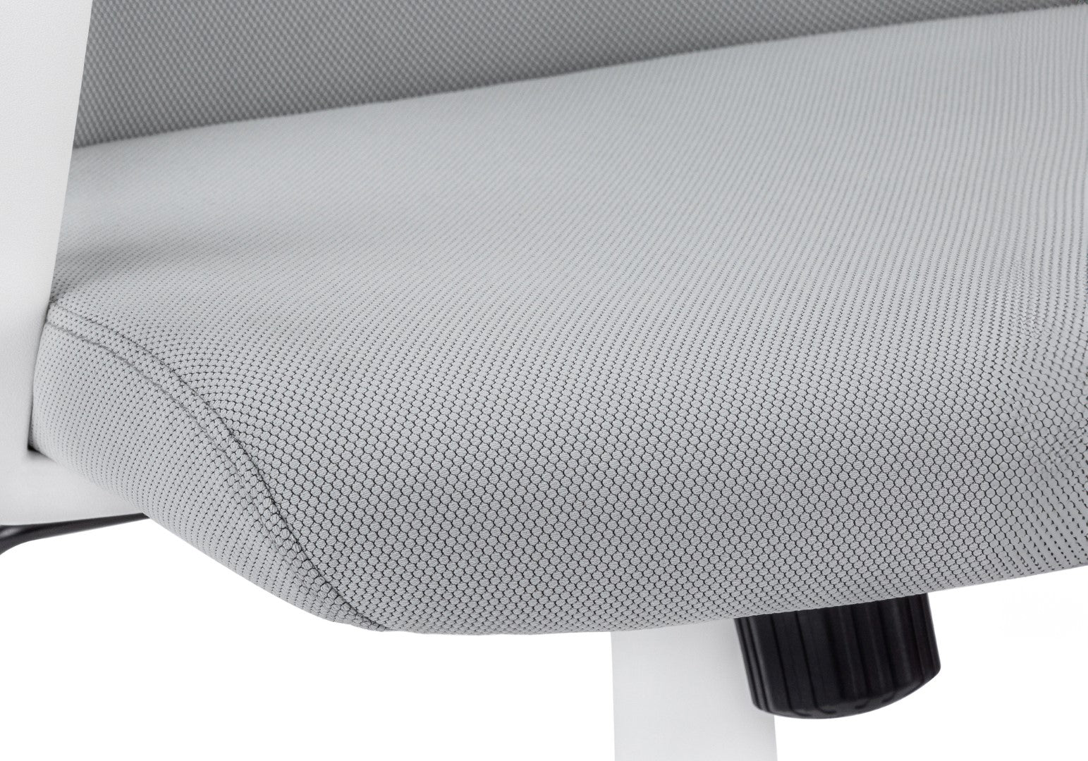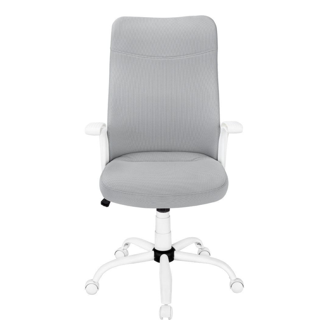 - High-back executive office chair with fixed armrests in white and soft, polyester fabric in grey