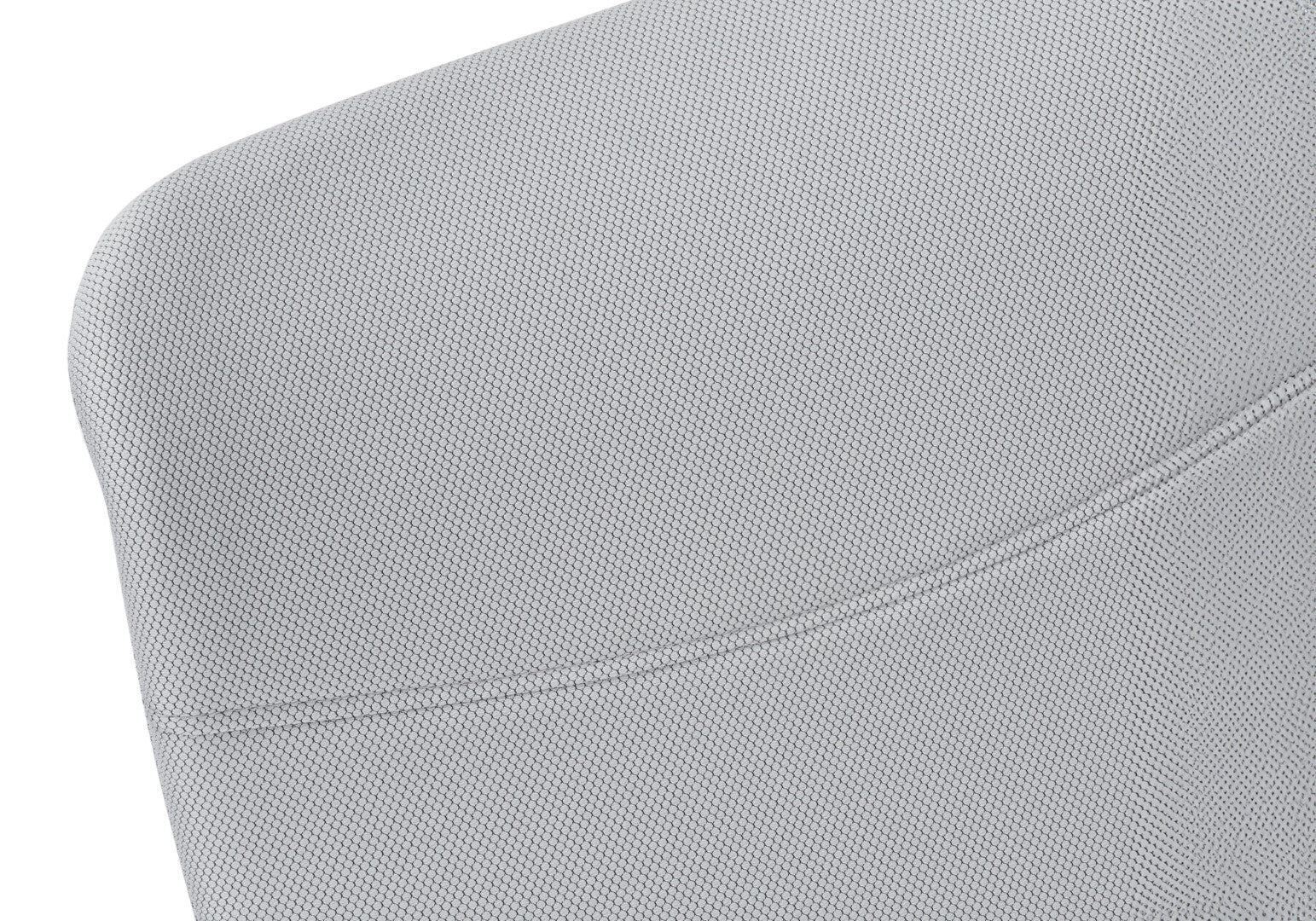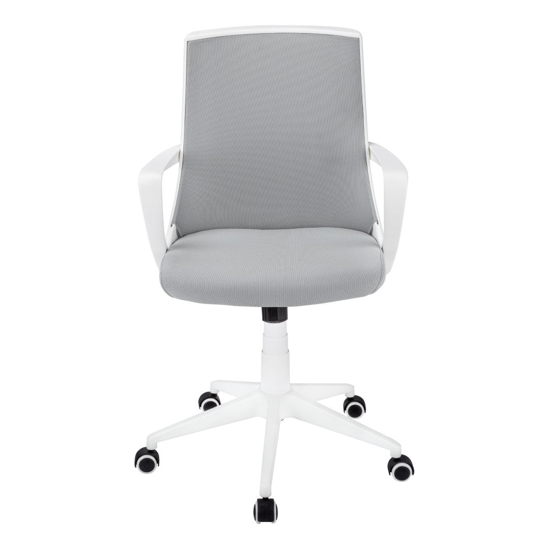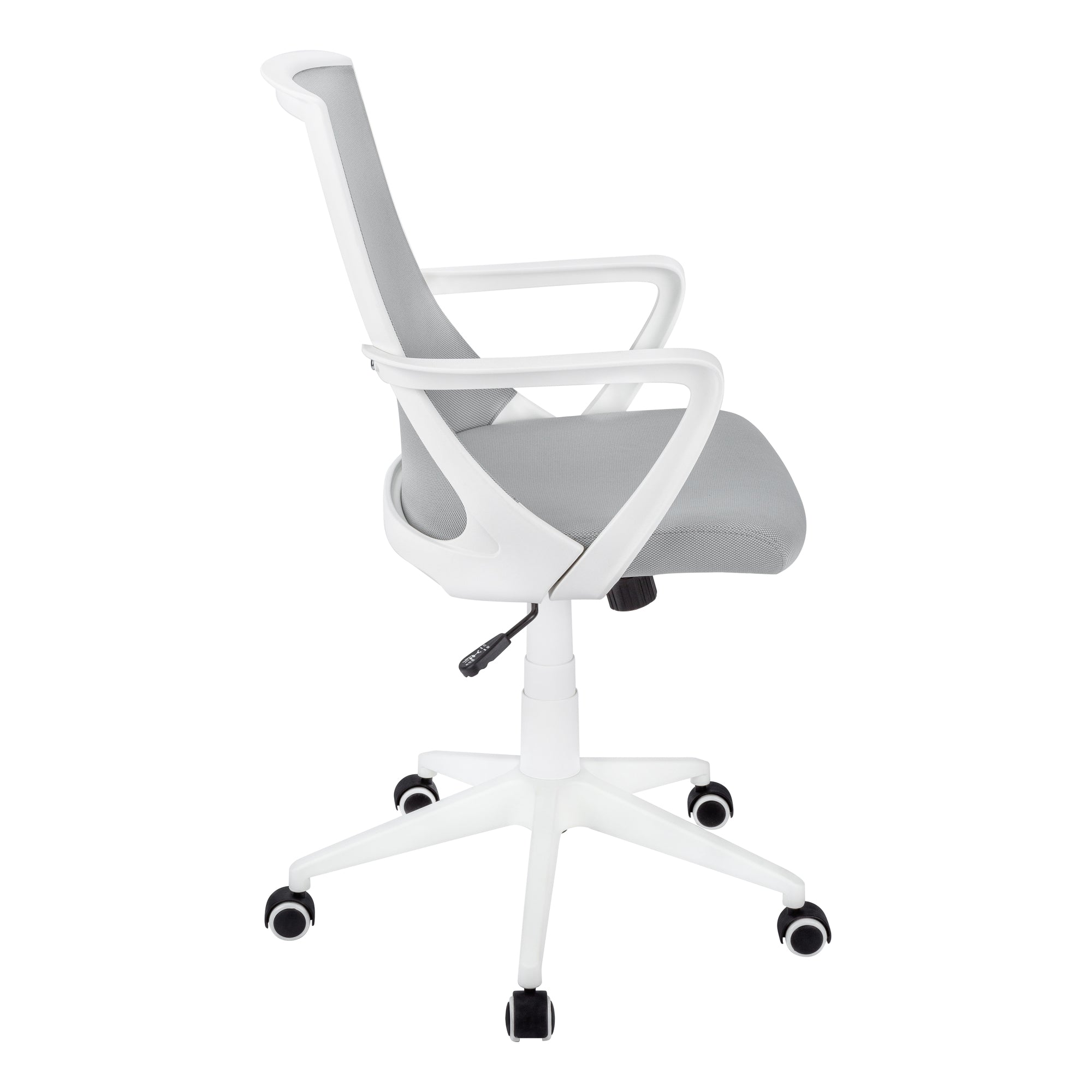 - High-back executive office chair with fixed armrests in white and soft, polyester fabric in grey