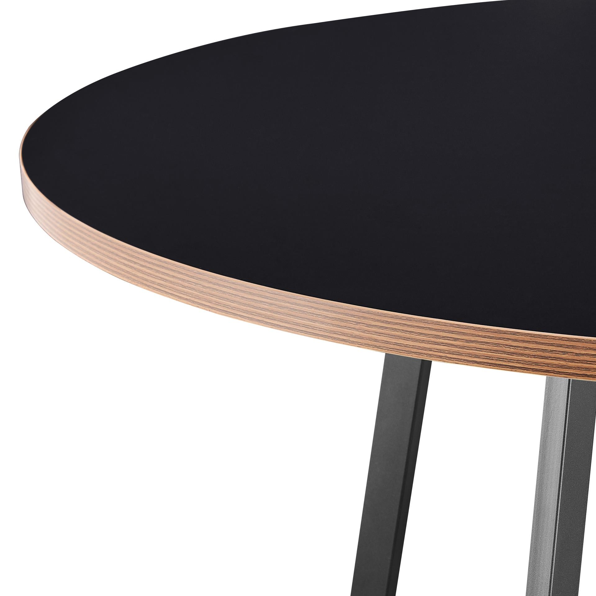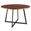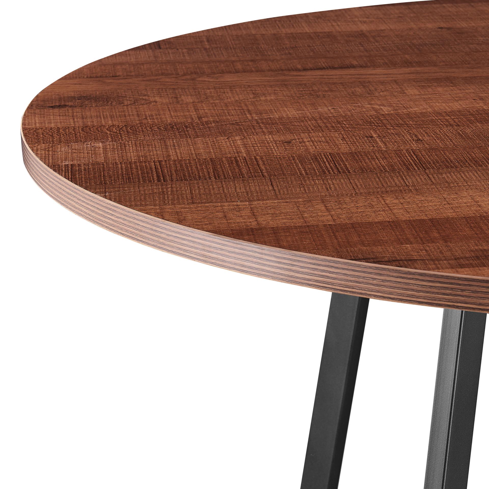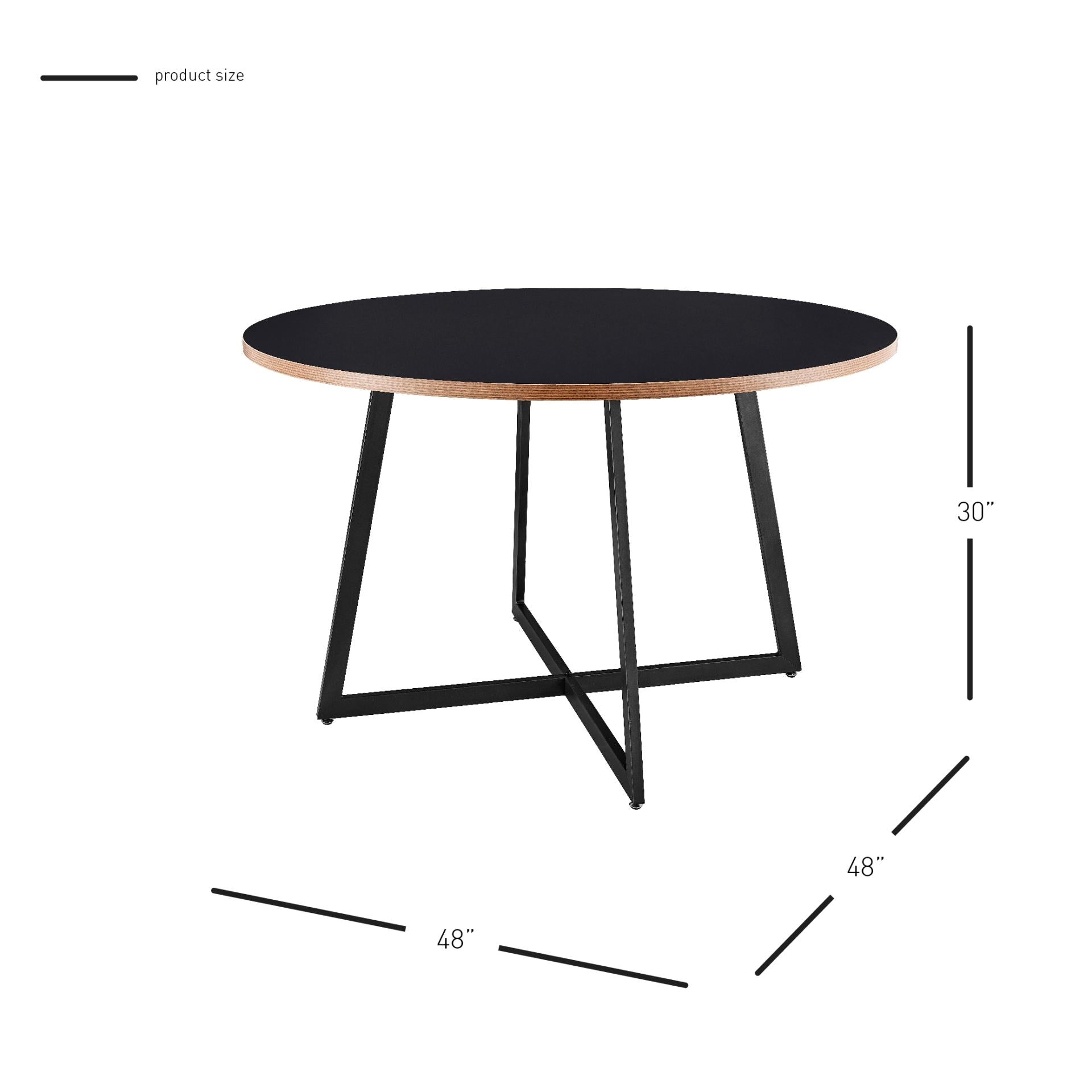- Feature 1: Modern Minimalist - round shape 48" table top in sleek Brown melamine finish is complemented on angular metallic gunmetal powder coated steel legs.