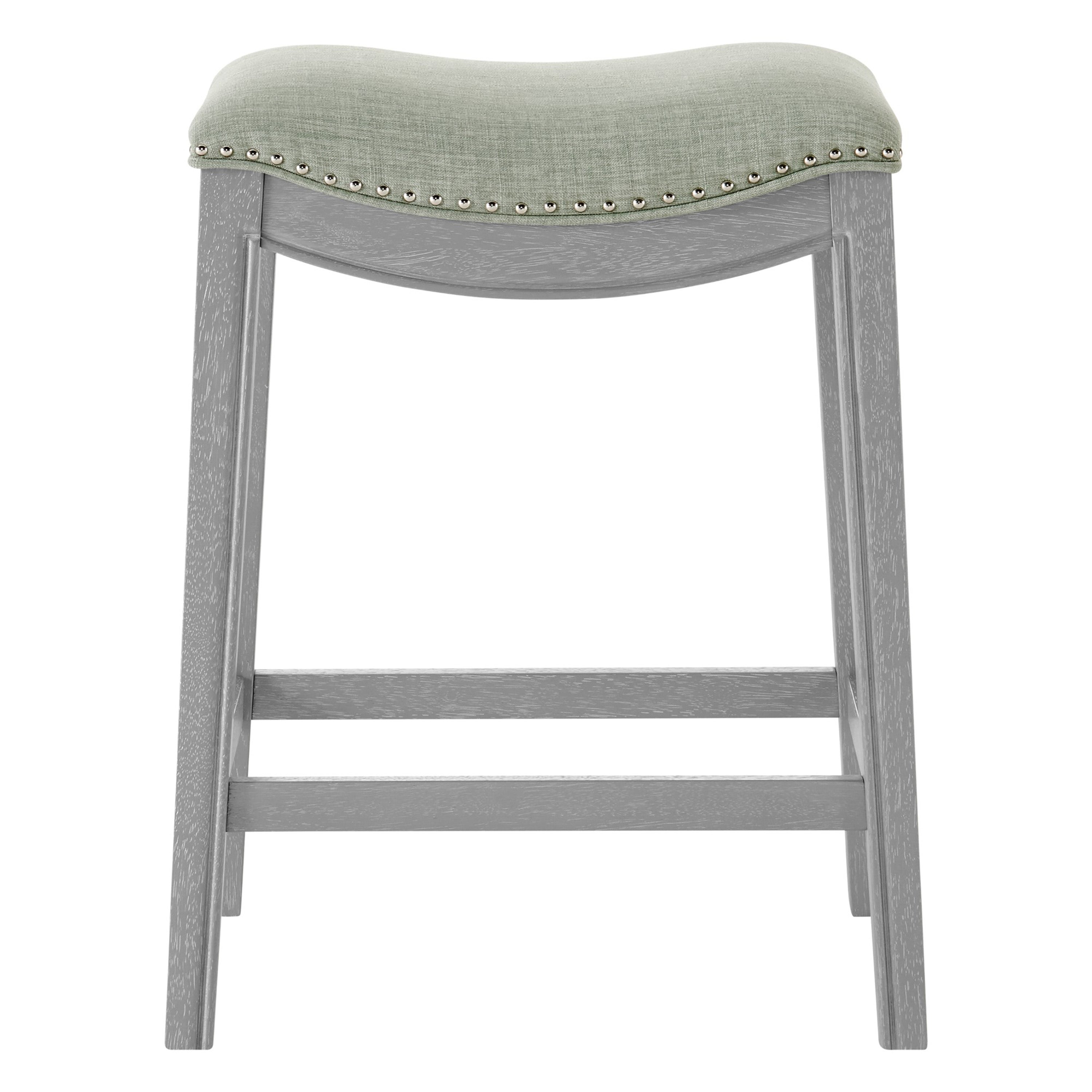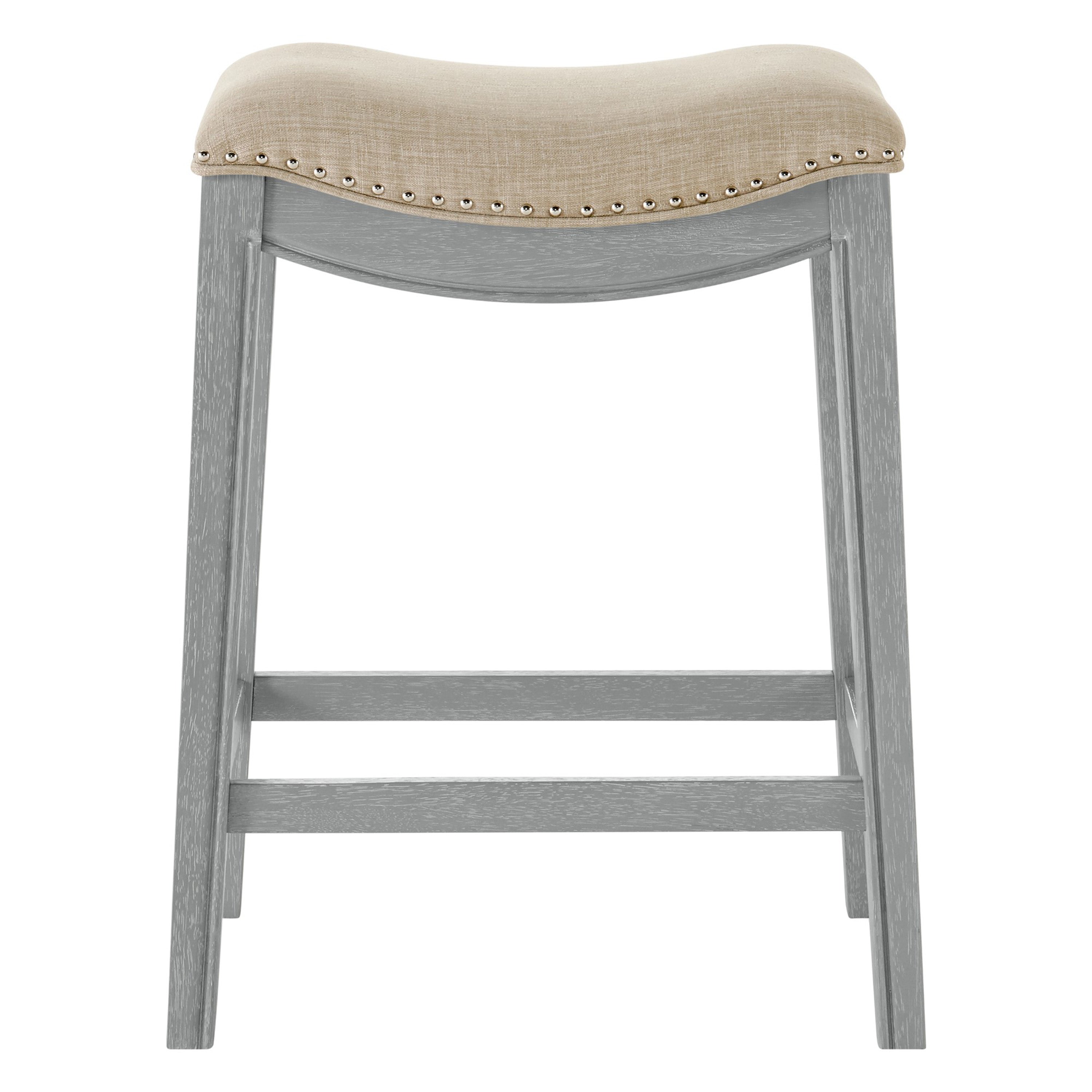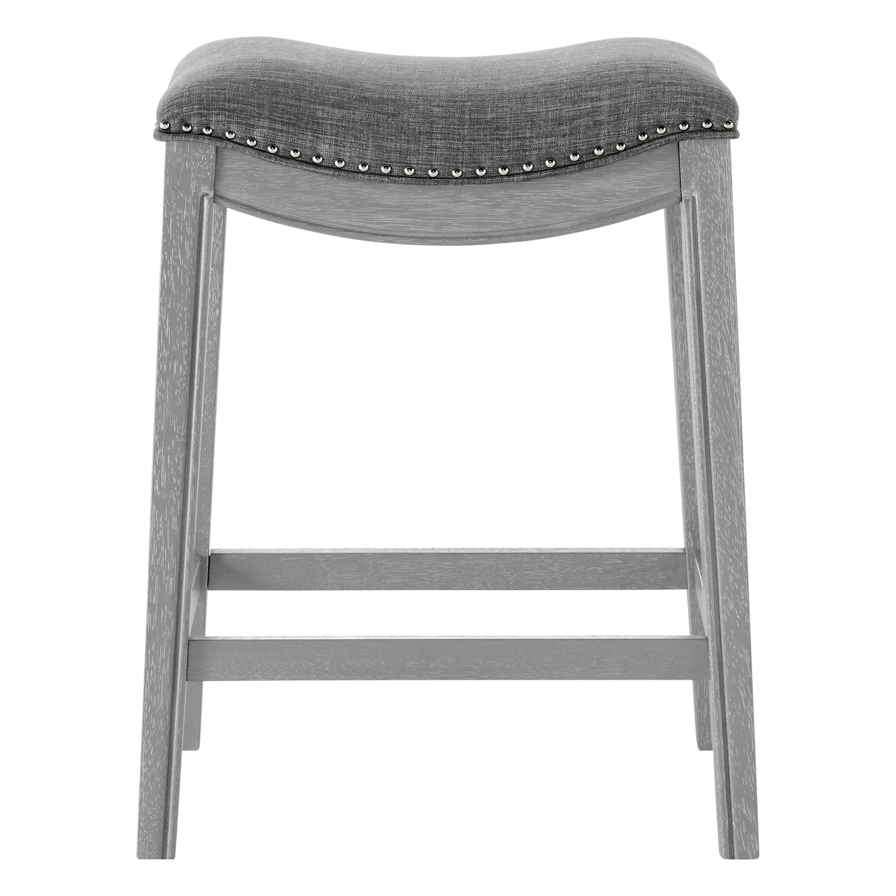 - Feature 1: Stylish, Sturdy, Comfortable, and Affordable – Quality with confidence. This 25.5" height counter stool is updated with Ash Gray painted wood frame and includes desirable features like individually placed Silver nailheads and stylish linen-like upholstered saddle seat. Foot rest is included for comfort and stability.