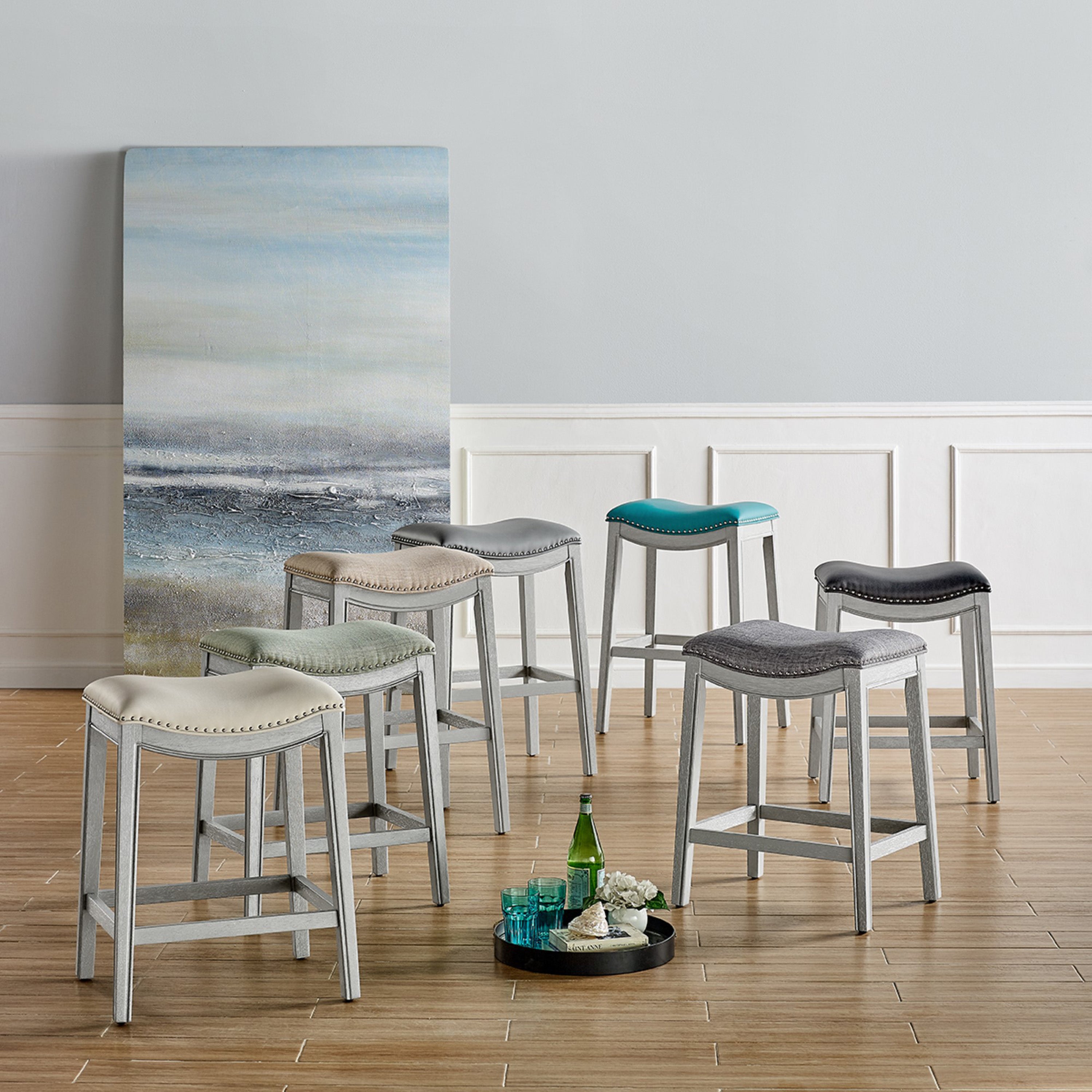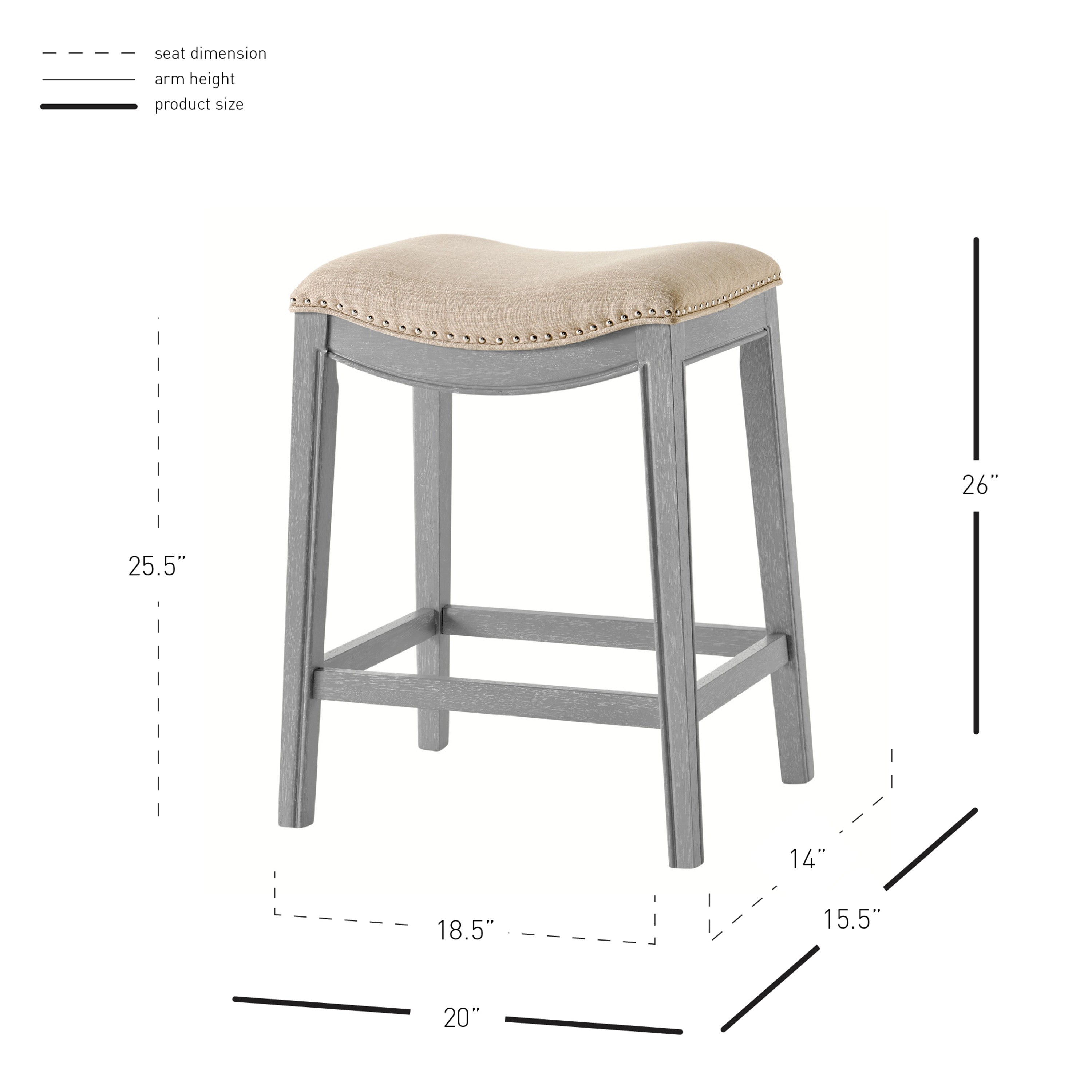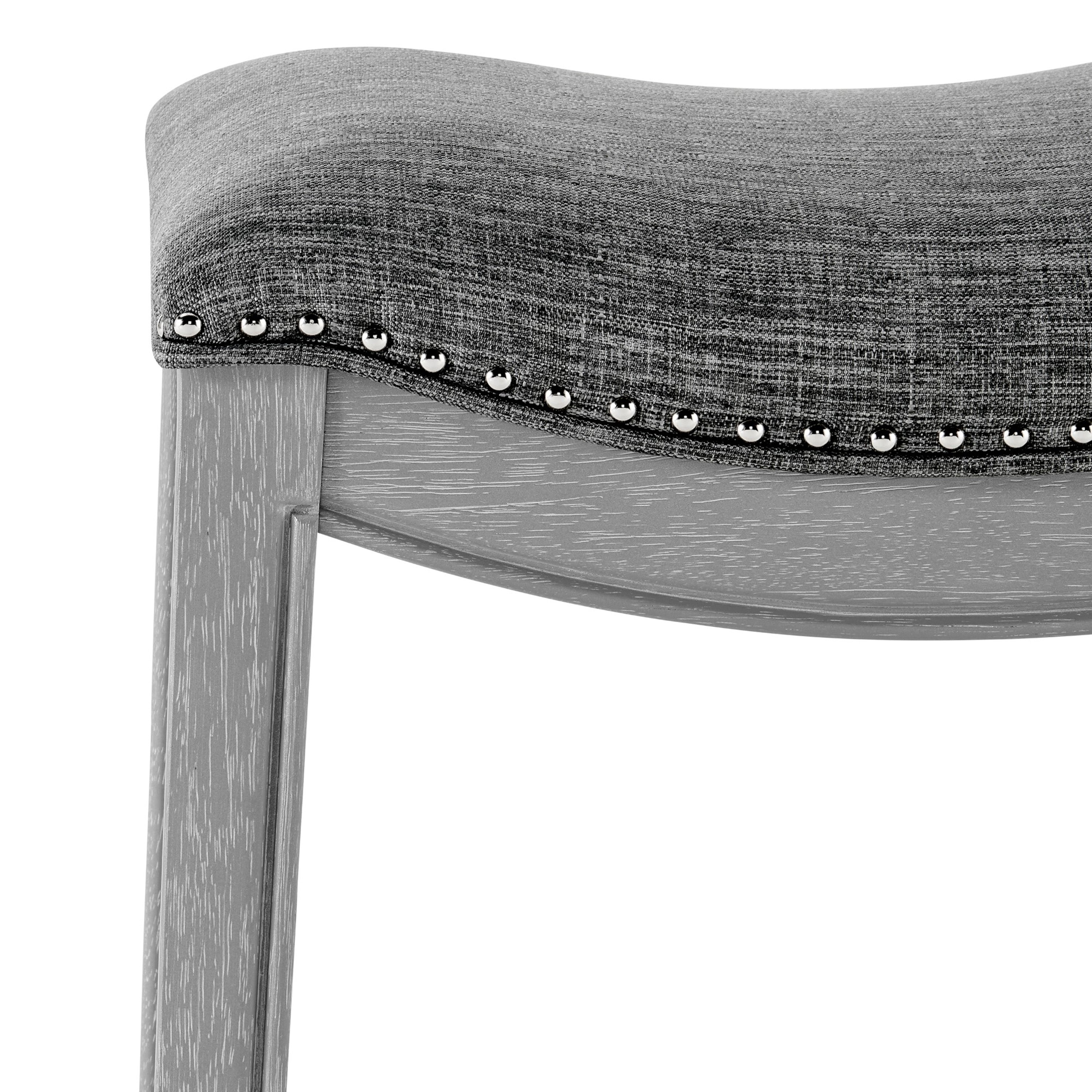 - Feature 1: Stylish, Sturdy, Comfortable, and Affordable – Quality with confidence. This 25.5" height counter stool is updated with Ash Gray painted wood frame and includes desirable features like individually placed Silver nailheads and stylish linen-like upholstered saddle seat. Foot rest is included for comfort and stability.