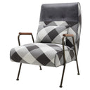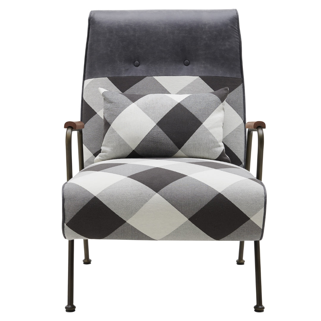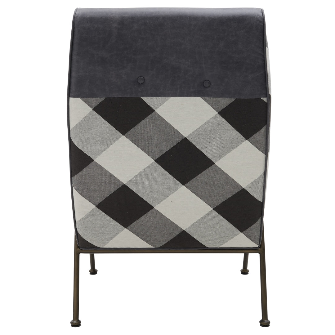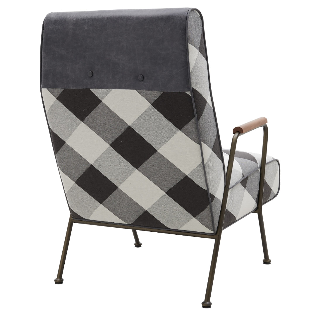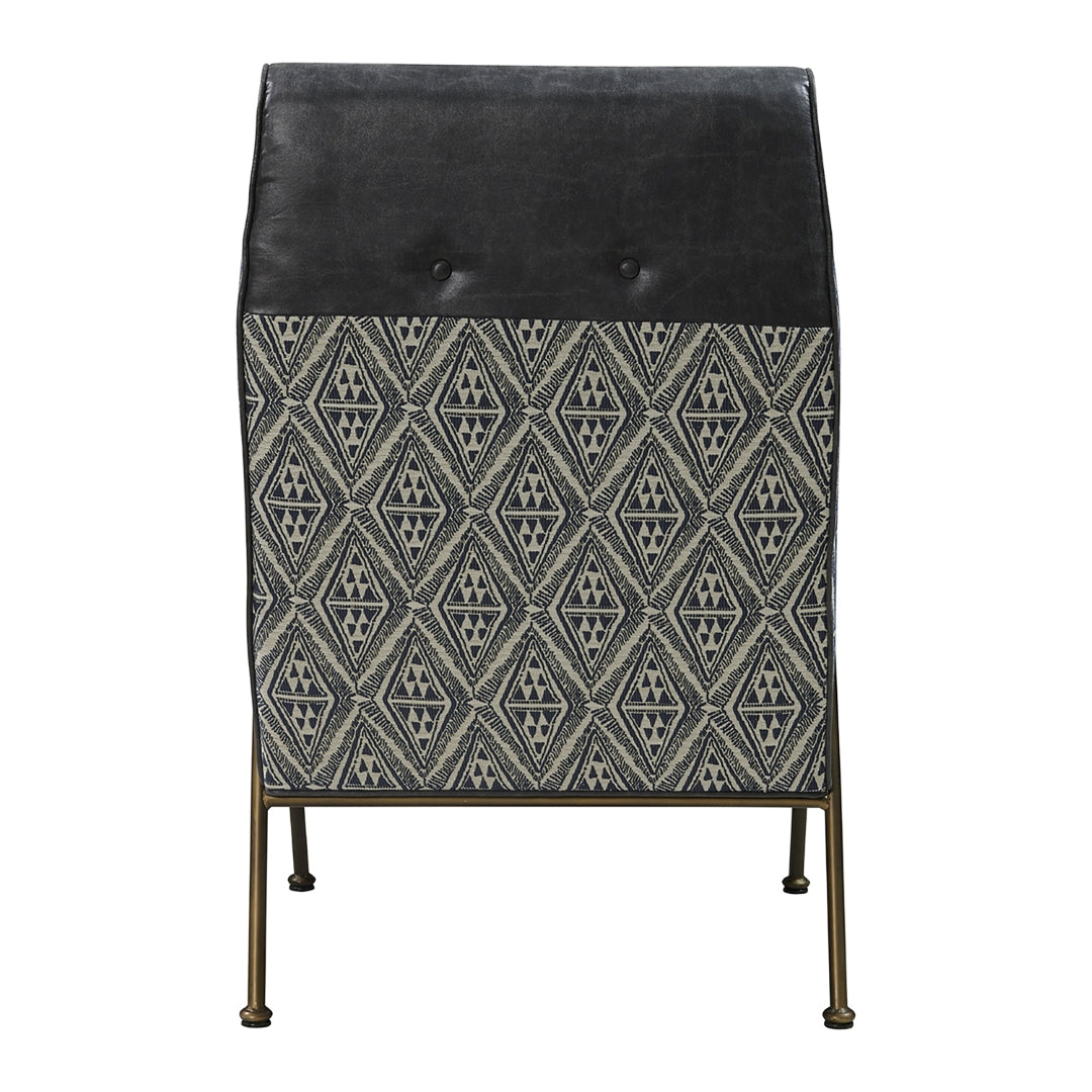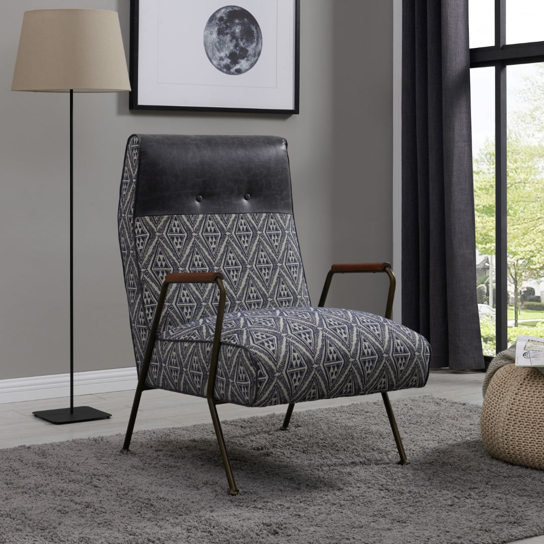- Feature 1: Retro style arm chair highlights duo-tone faux leather in navy contrasted with tribal pattern upholstery. Wood armrests and bronze painted iron frame completes its vintage disposition.