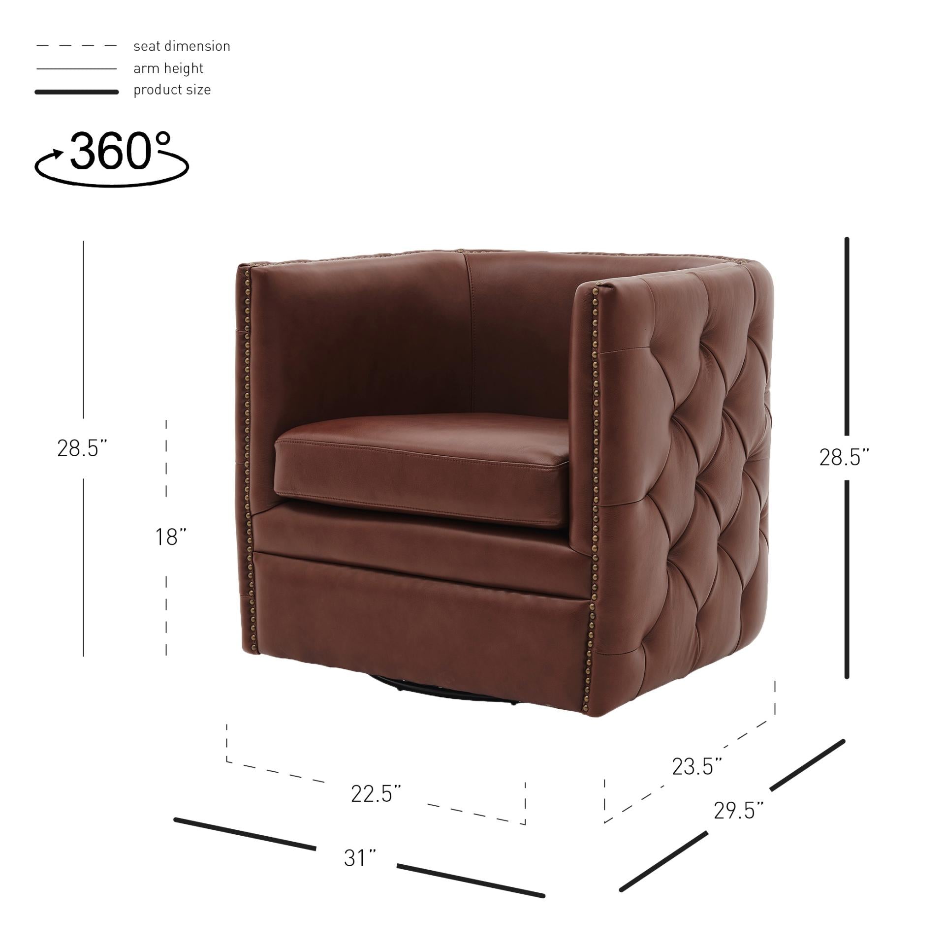 - Feature 1: Handsome and Contemporary Shelter Style Arm Chair incorporates top grain leather in Brown tone upholstery with charming button tufted back side, embellished with Bronze nailheads trimming. Includes removable cushion and 360-degree swiveling function.
