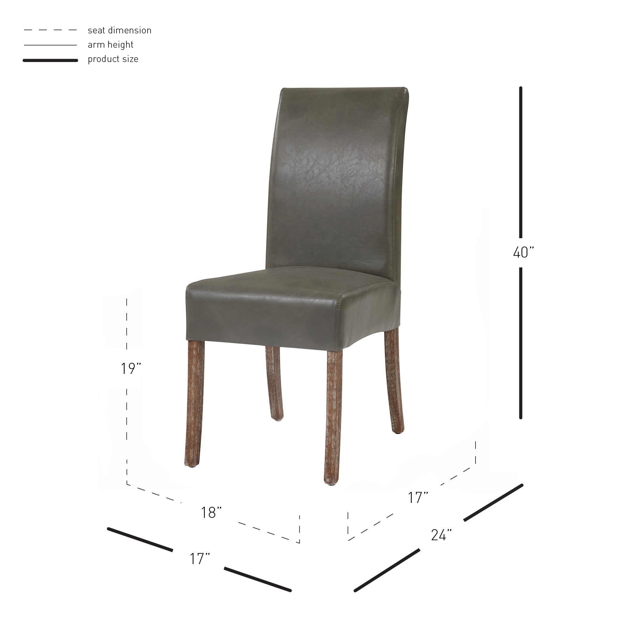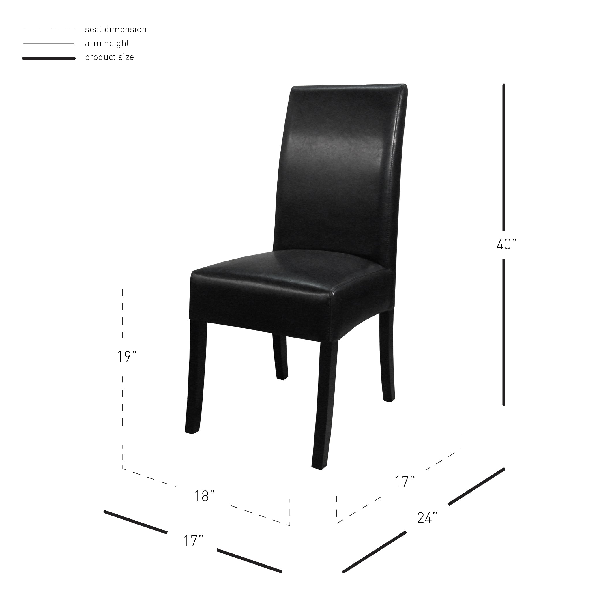 - Feature 5: Product measurement is taken from the highest point and widest part of the item. Dimensions: 17.00"w 24.00"d 40.00"h. Seat Height: 19"h. Seat Dimensions: 18"x17". Maximum bearing weight: 250 lbs.