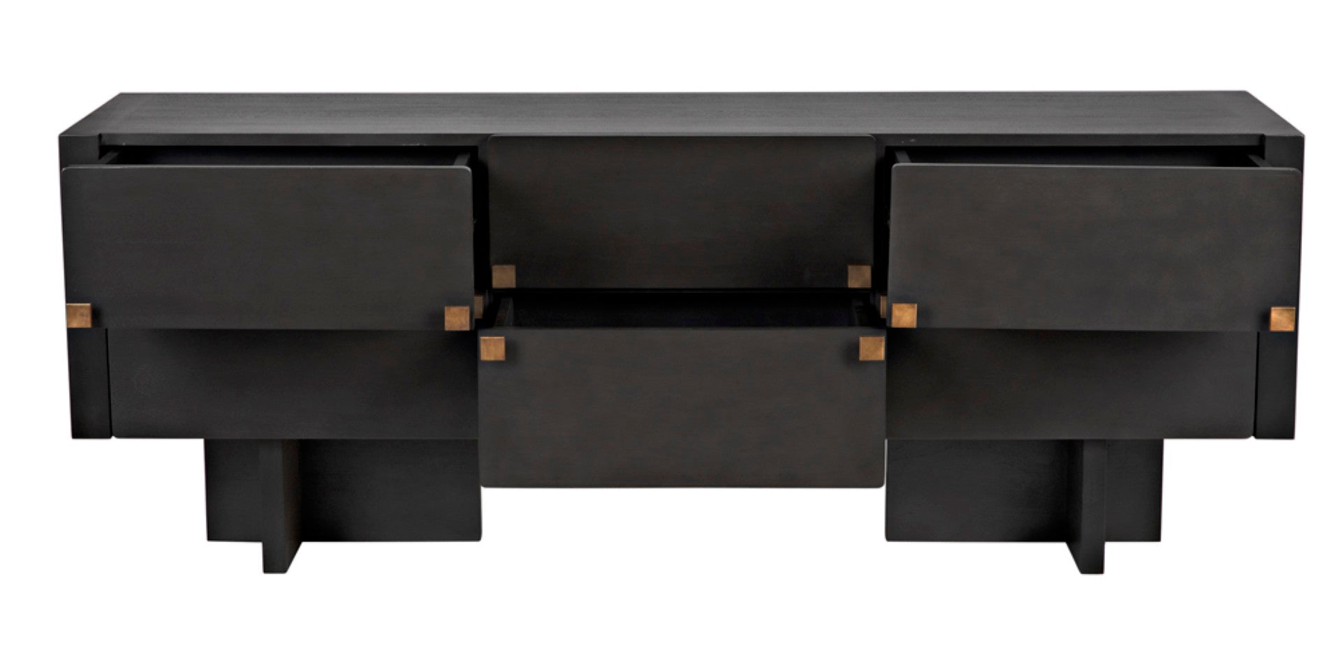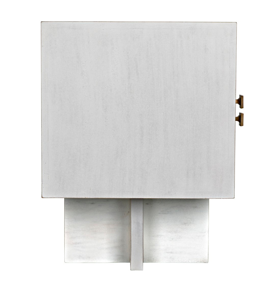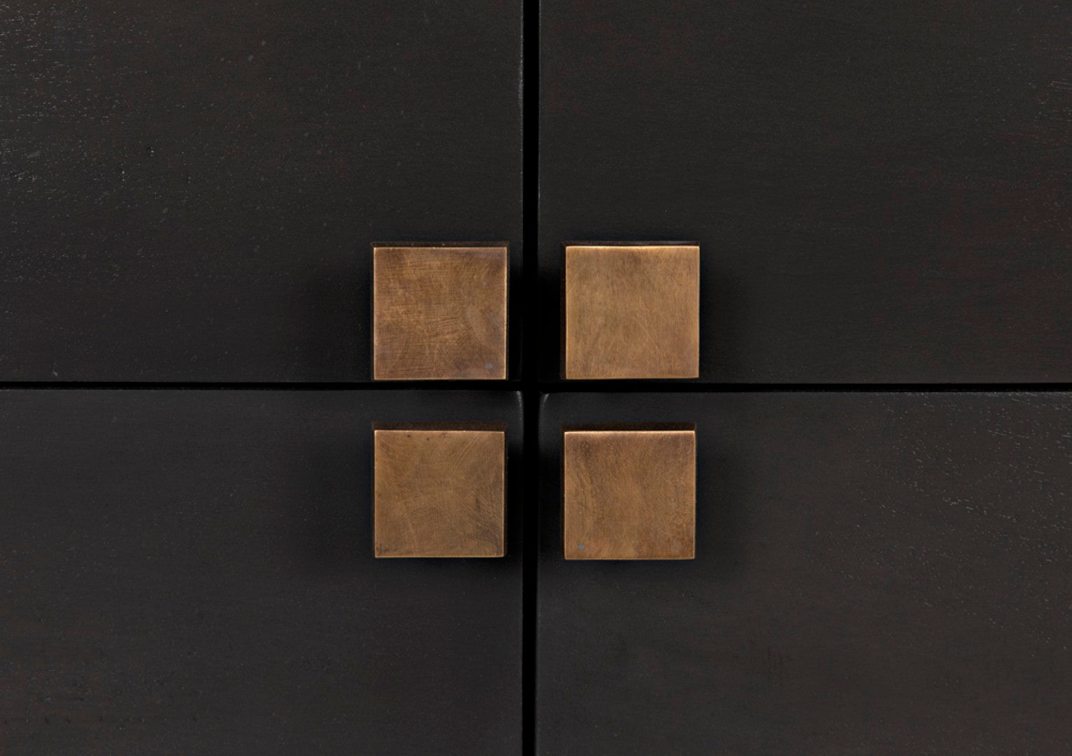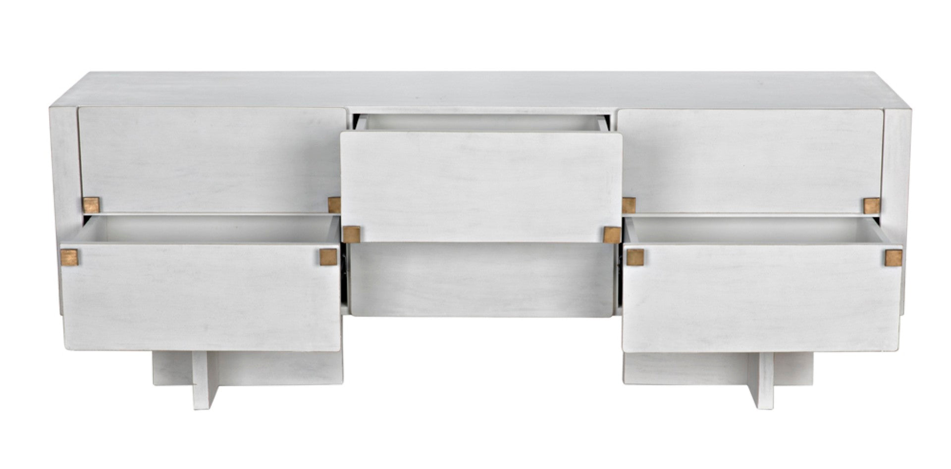 - Hardware: Brass square drawer pulls that serve as both functional elements and striking visual accents