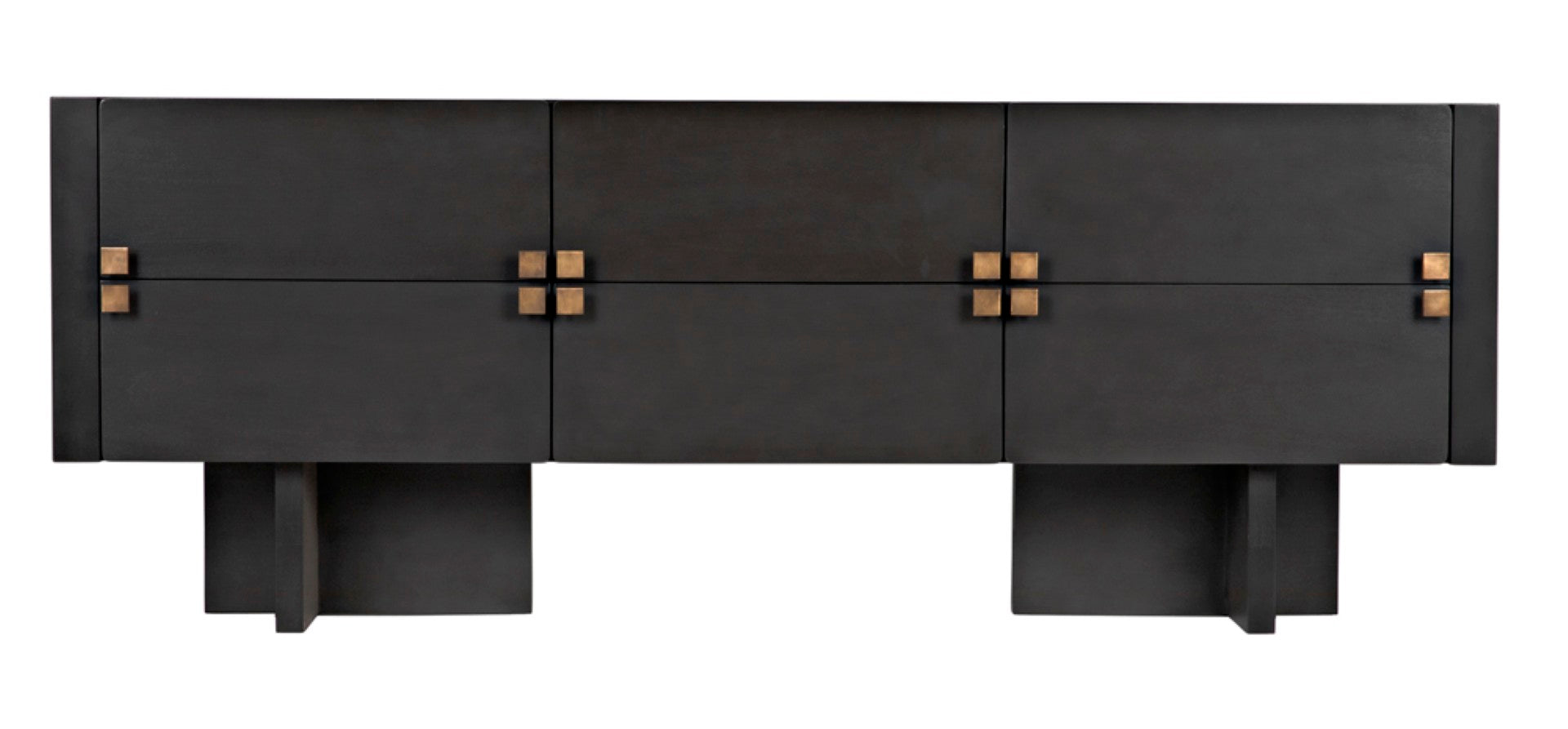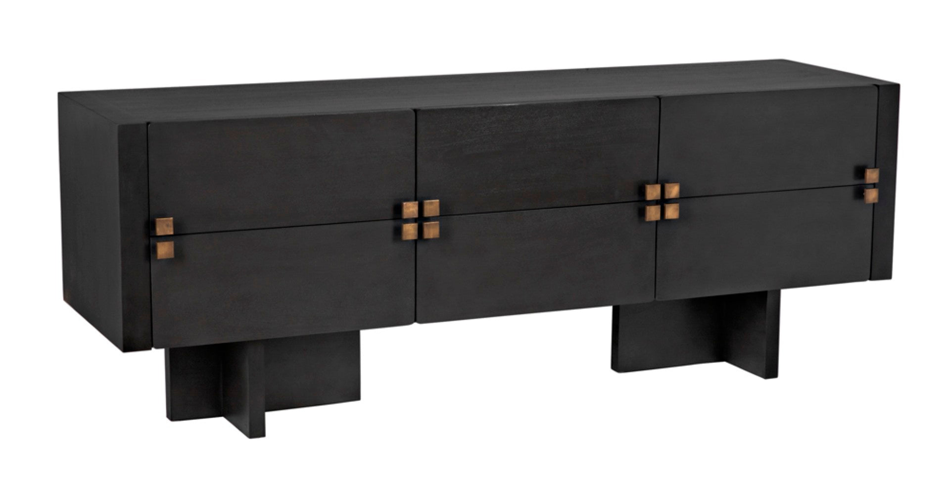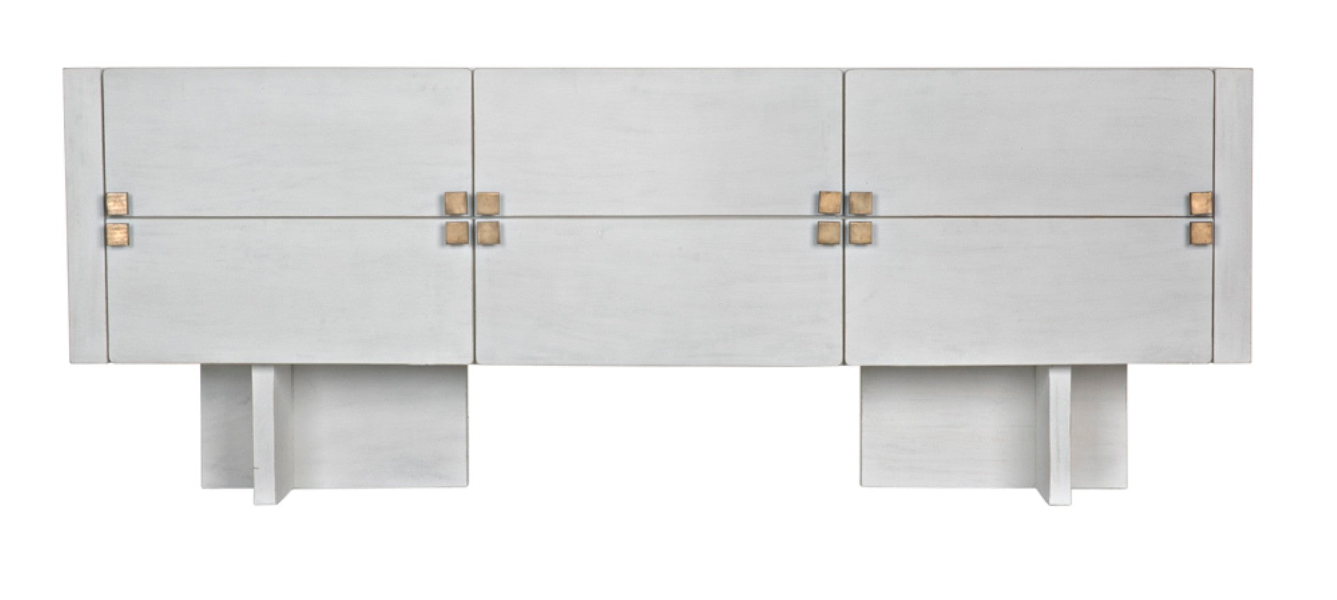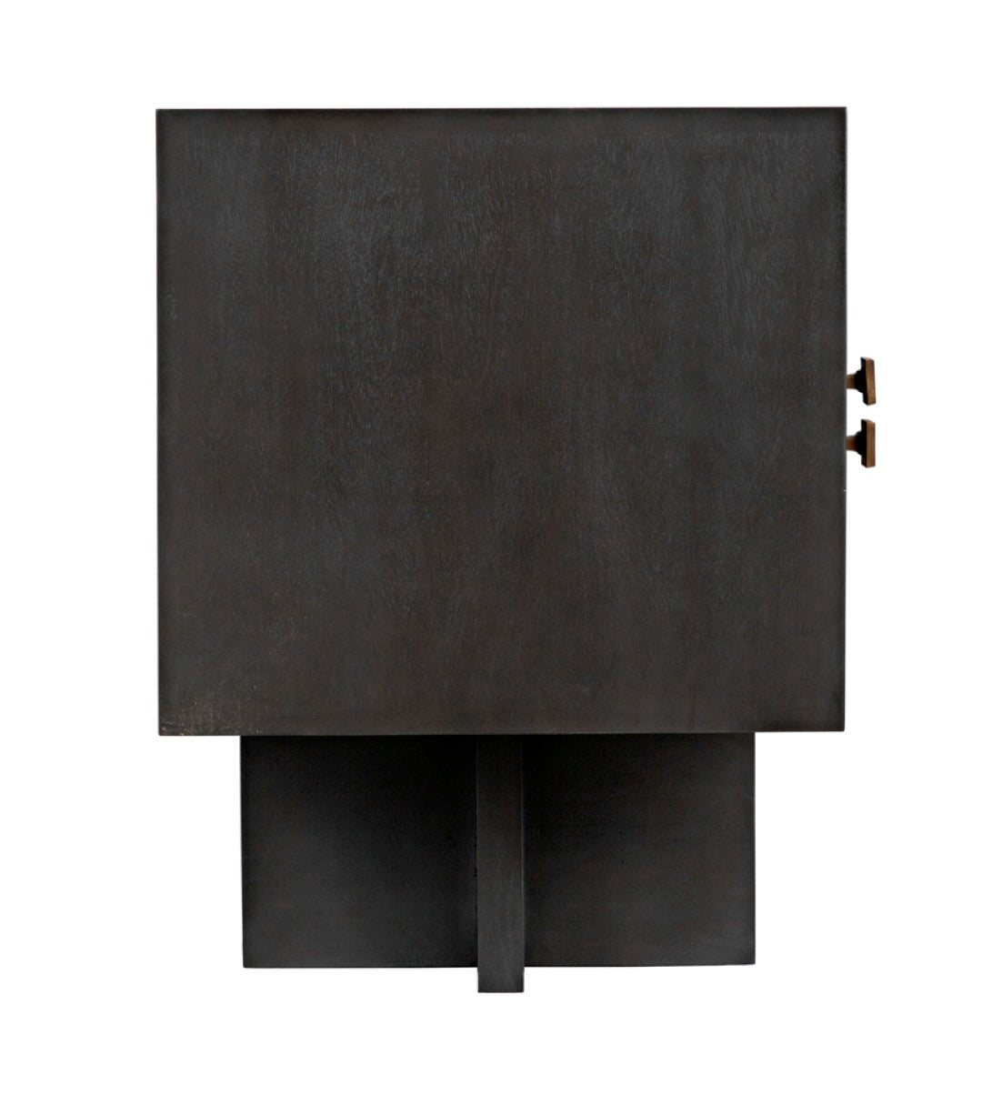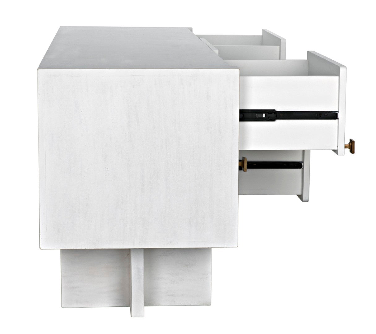 - Hardware: Brass square drawer pulls that serve as both functional elements and striking visual accents