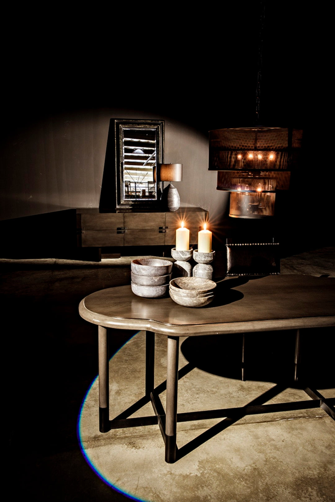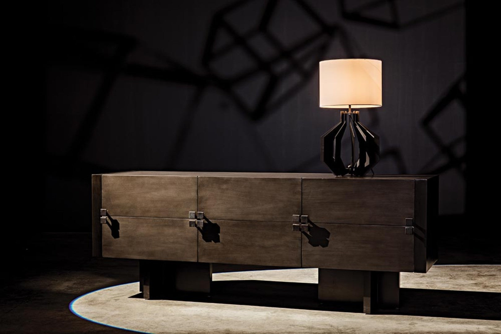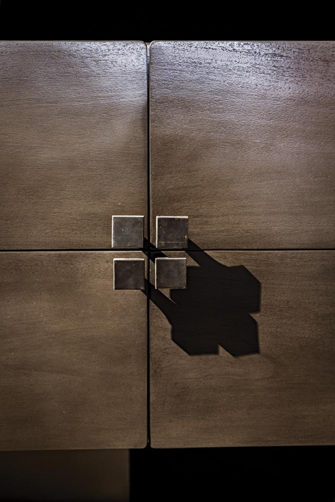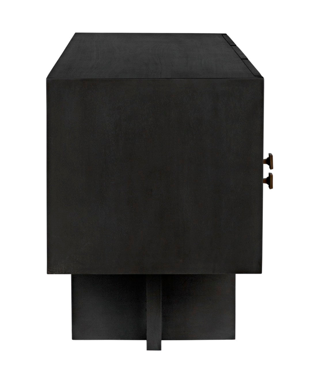 - Hardware: Brass square drawer pulls that serve as both functional elements and striking visual accents