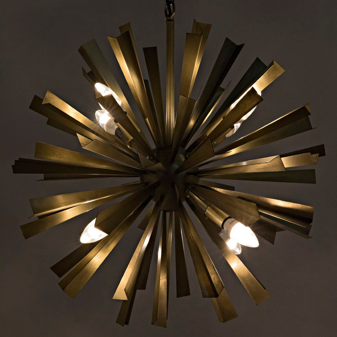 Elevate your space with a striking mid-century modern centerpiece: a sculptural, three-dimensional starburst chandelier finished in warm antique brass. The Bero Chandelier blends vintage-inspired form with contemporary boldness, creating dynamic visual interest from every angle while providing ambient, flattering light through its exposed bulbs.