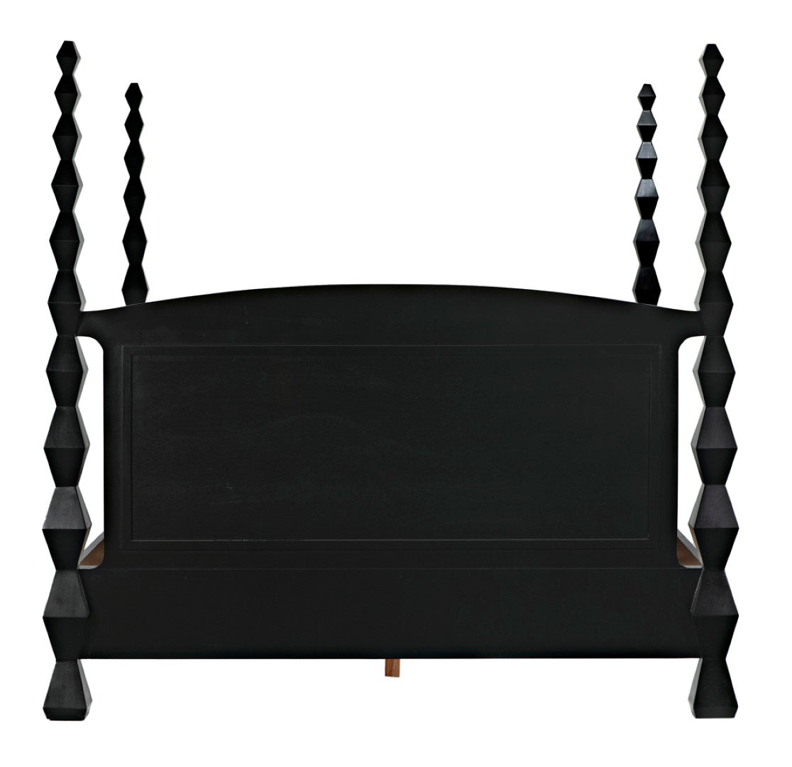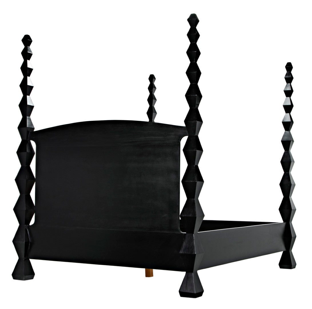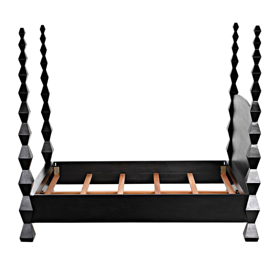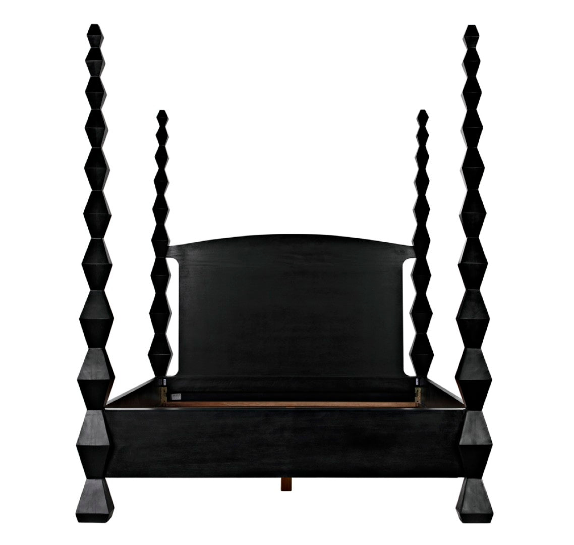 Evoking the clean lines and sculptural presence of modernist art, this four-poster bed becomes a striking centerpiece for a contemporary or transitional bedroom. Crafted from solid mahogany with a hand-rubbed black finish, the design highlights dramatic hourglass posts that read like totemic sculptures while providing a sturdy, luxurious foundation for restful sleep.