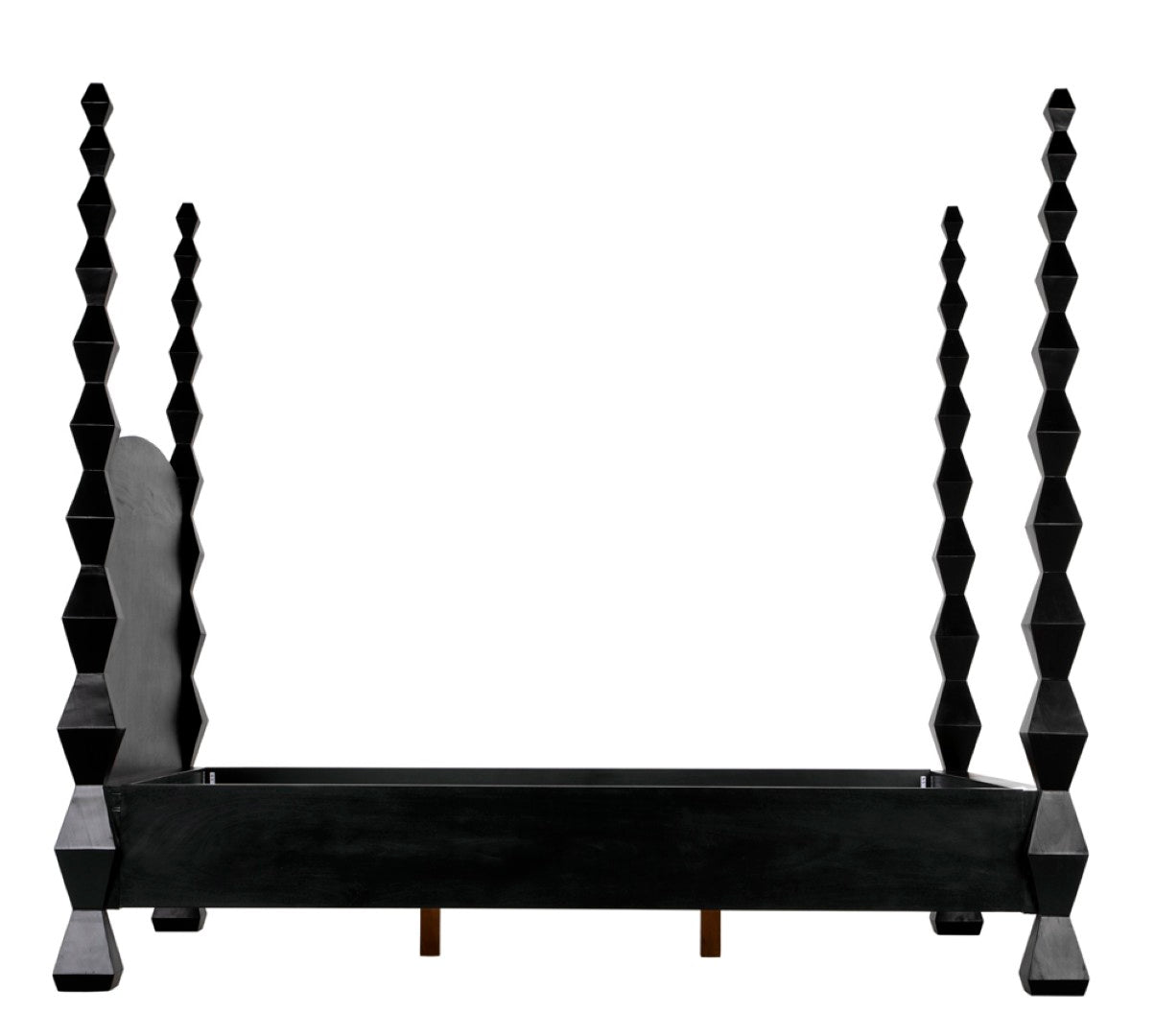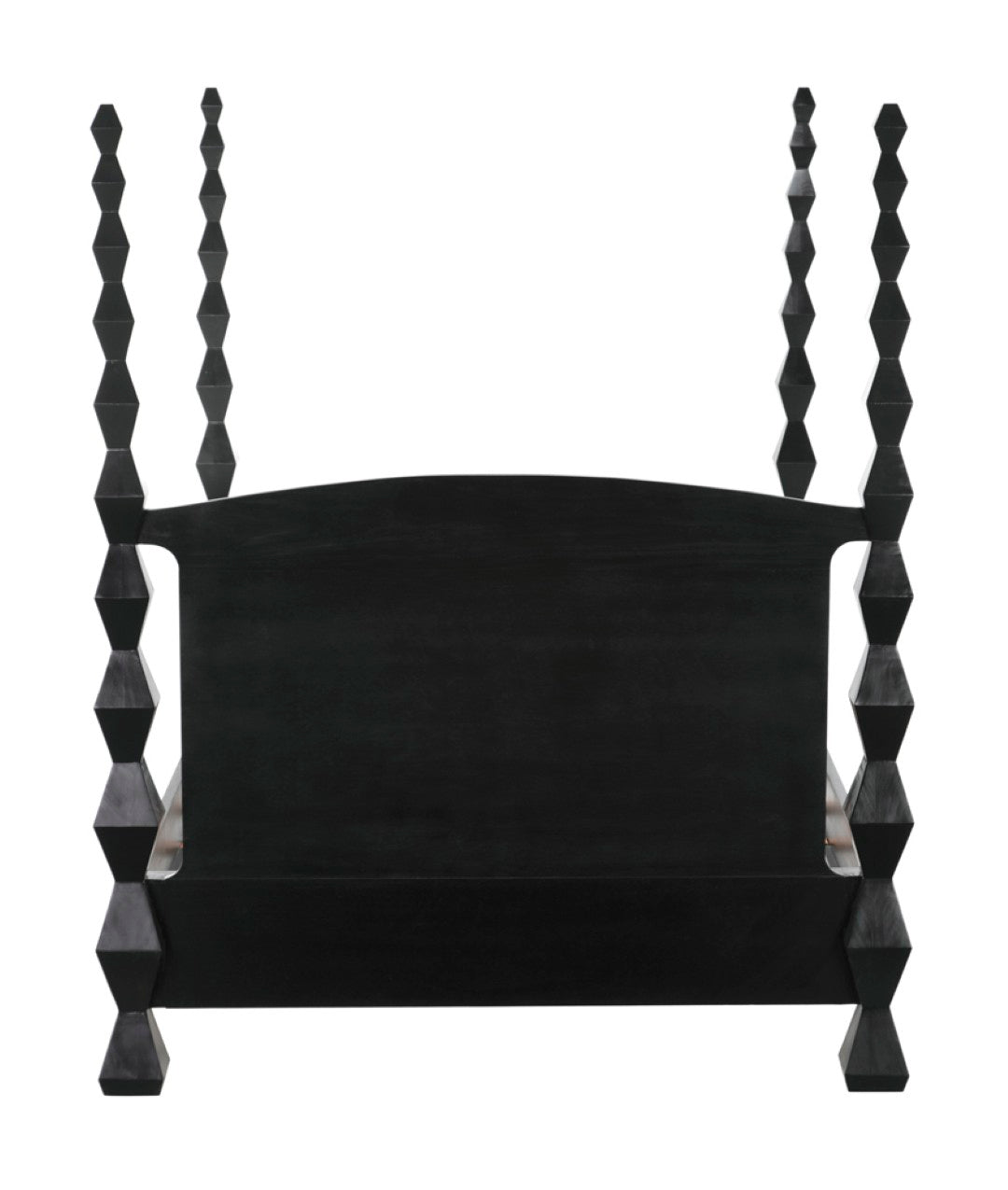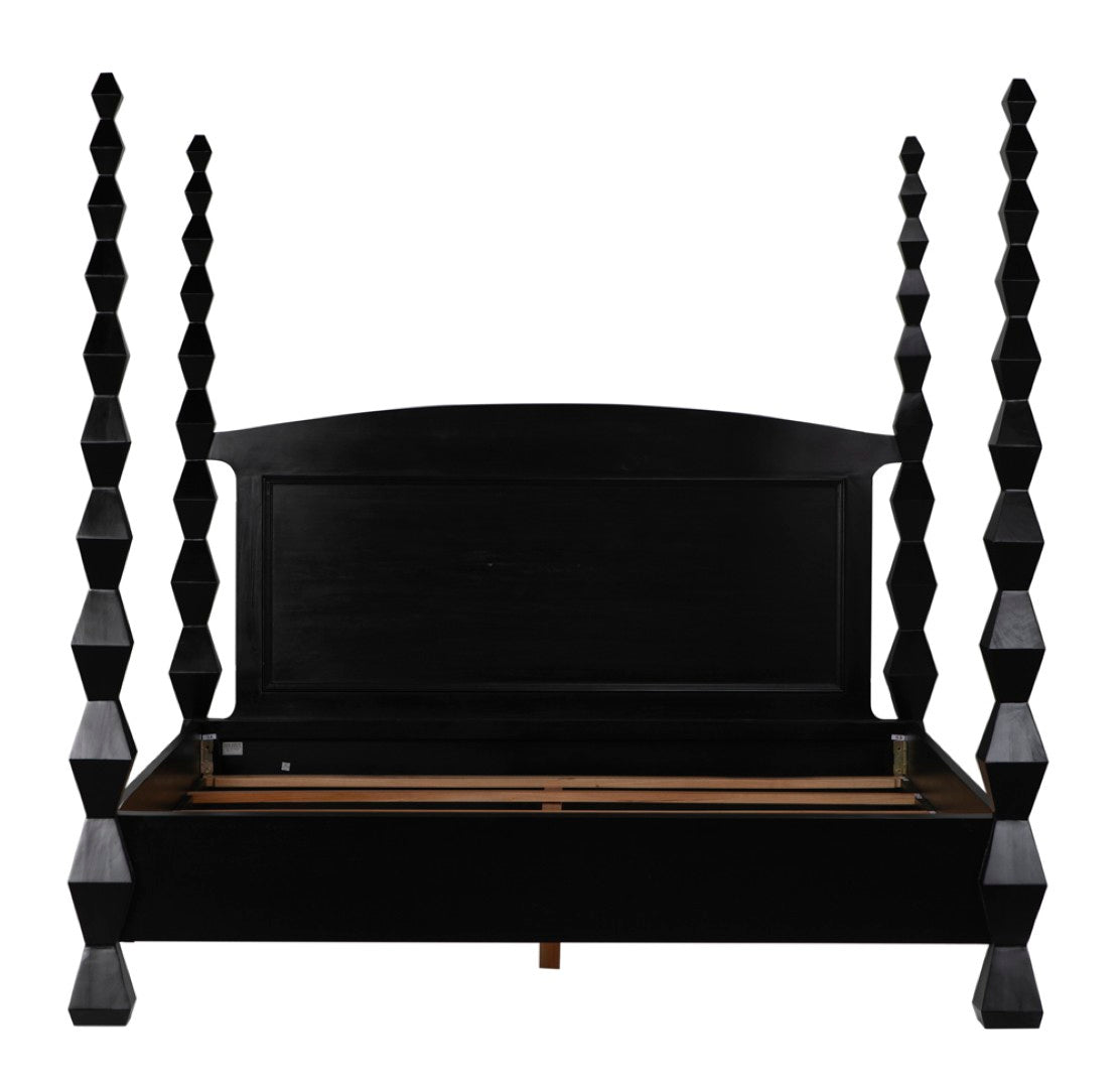 Evoking the clean lines and sculptural presence of modernist art, this four-poster bed becomes a striking centerpiece for a contemporary or transitional bedroom. Crafted from solid mahogany with a hand-rubbed black finish, the design highlights dramatic hourglass posts that read like totemic sculptures while providing a sturdy, luxurious foundation for restful sleep.