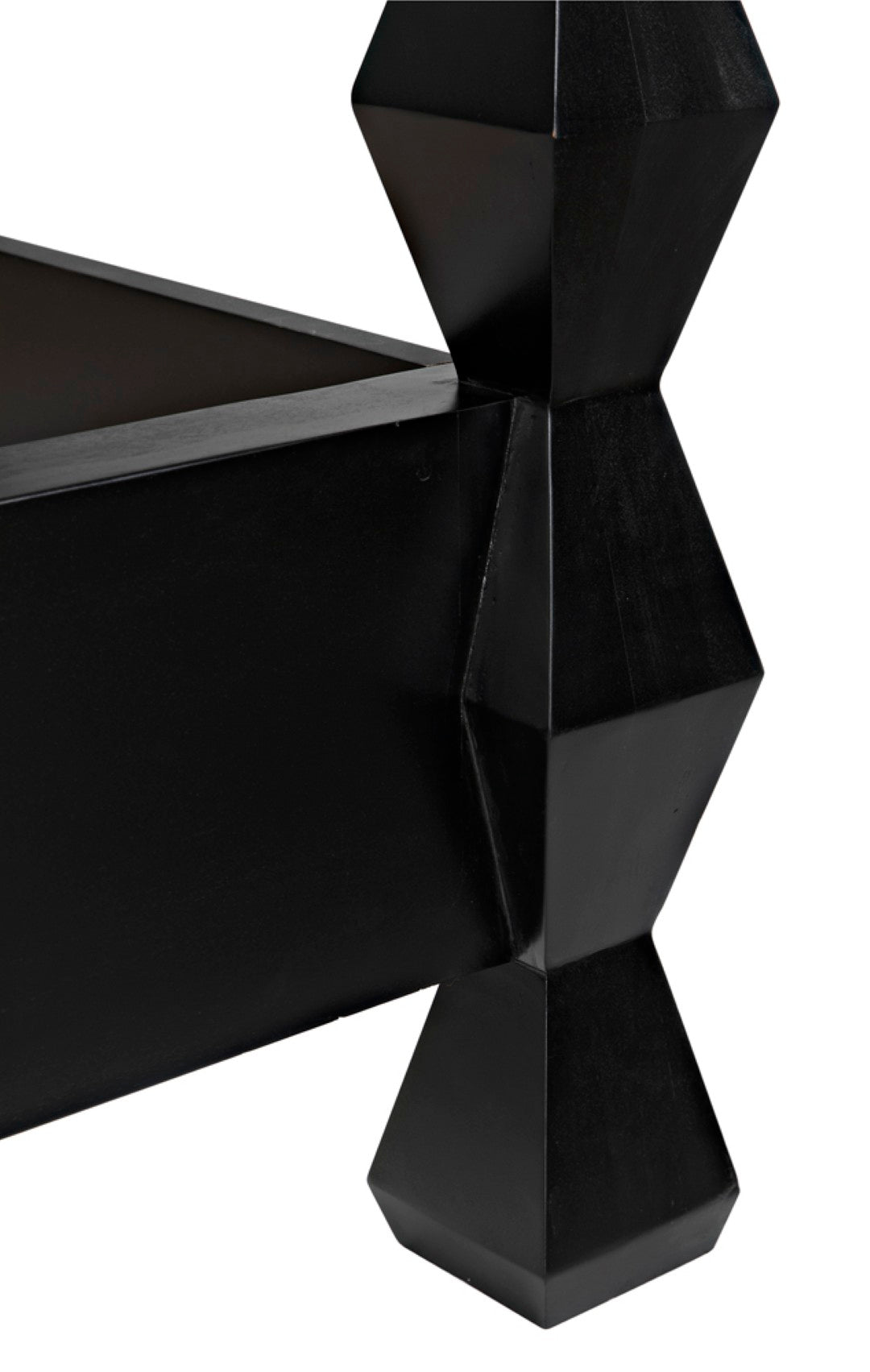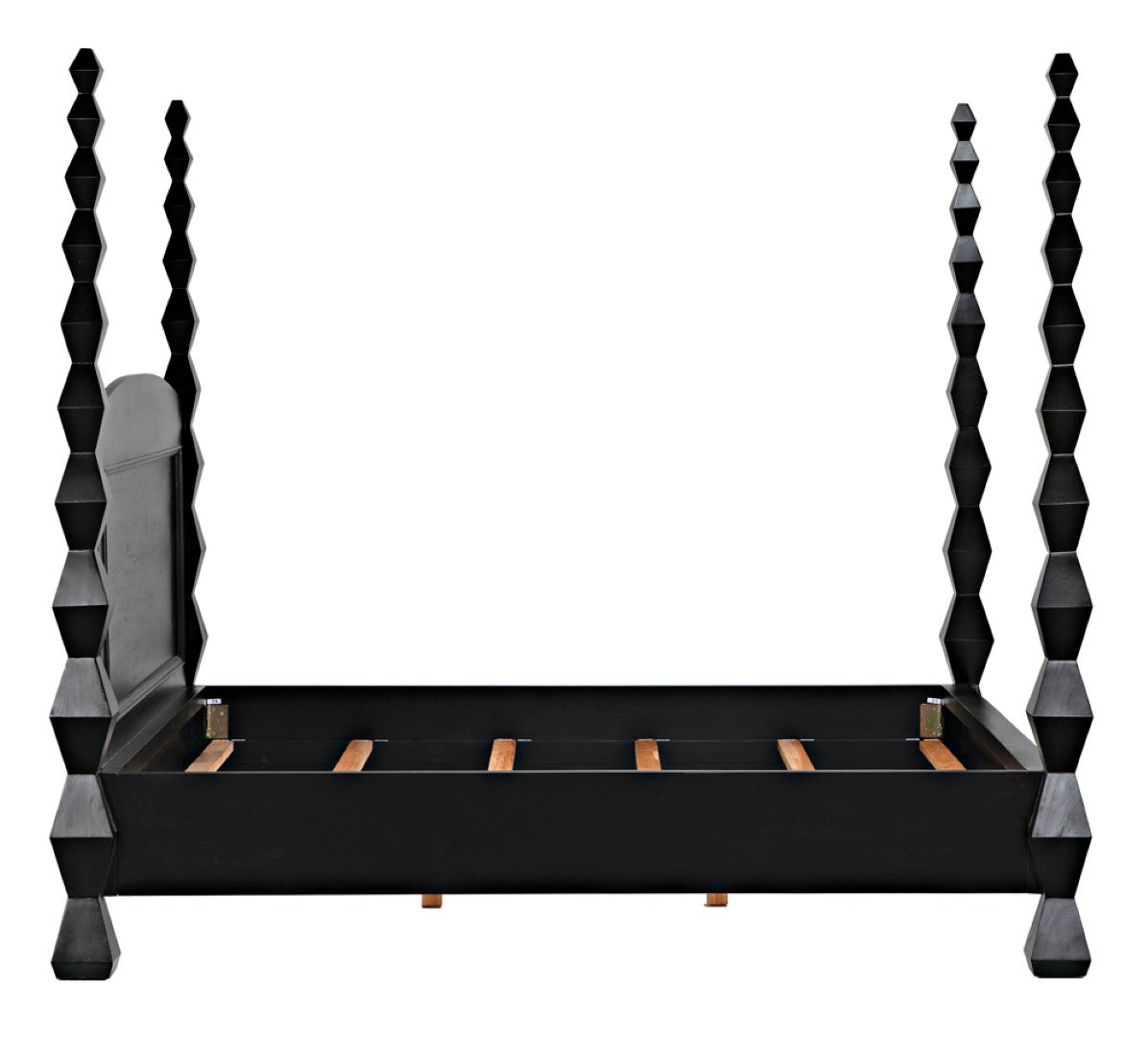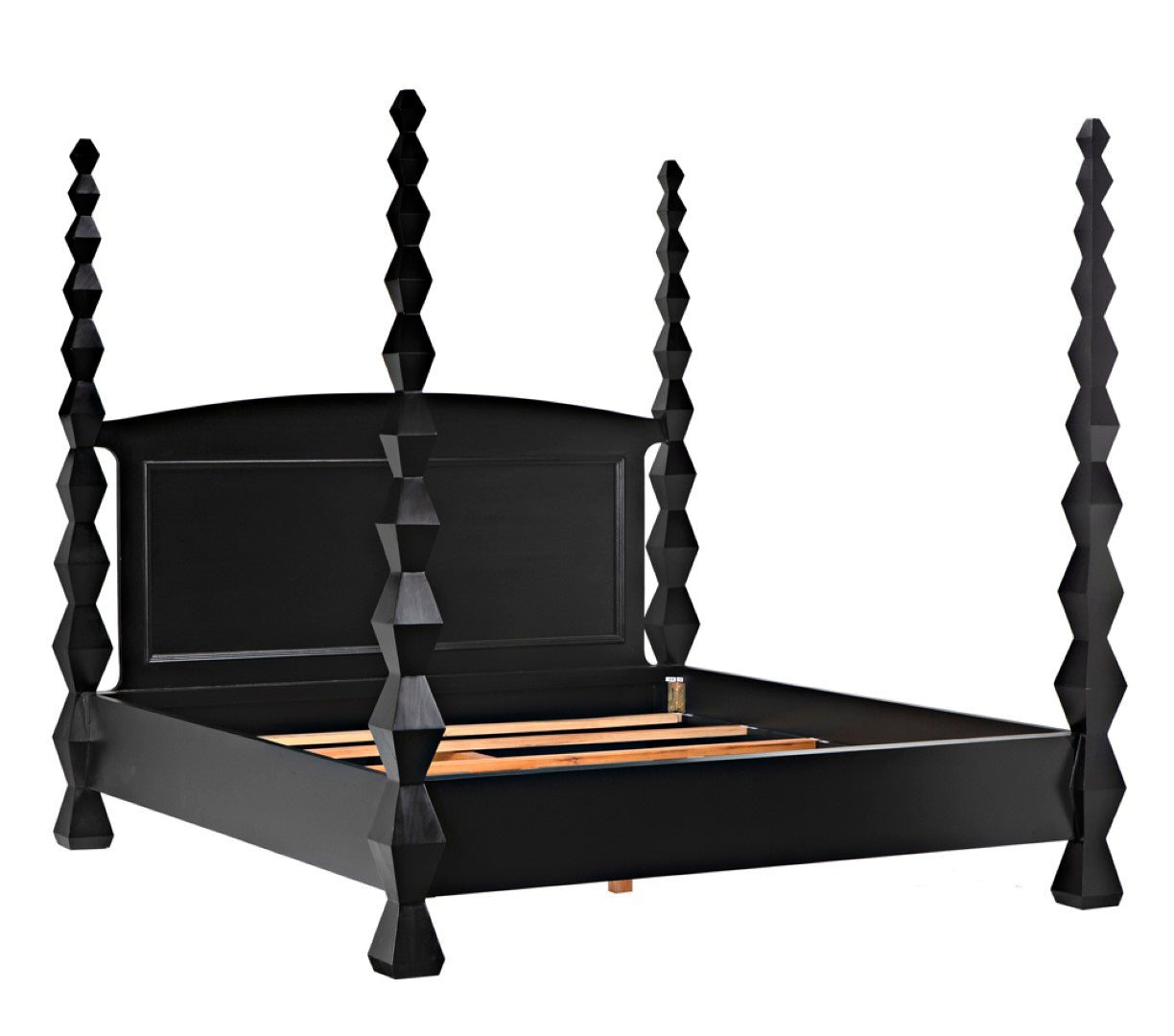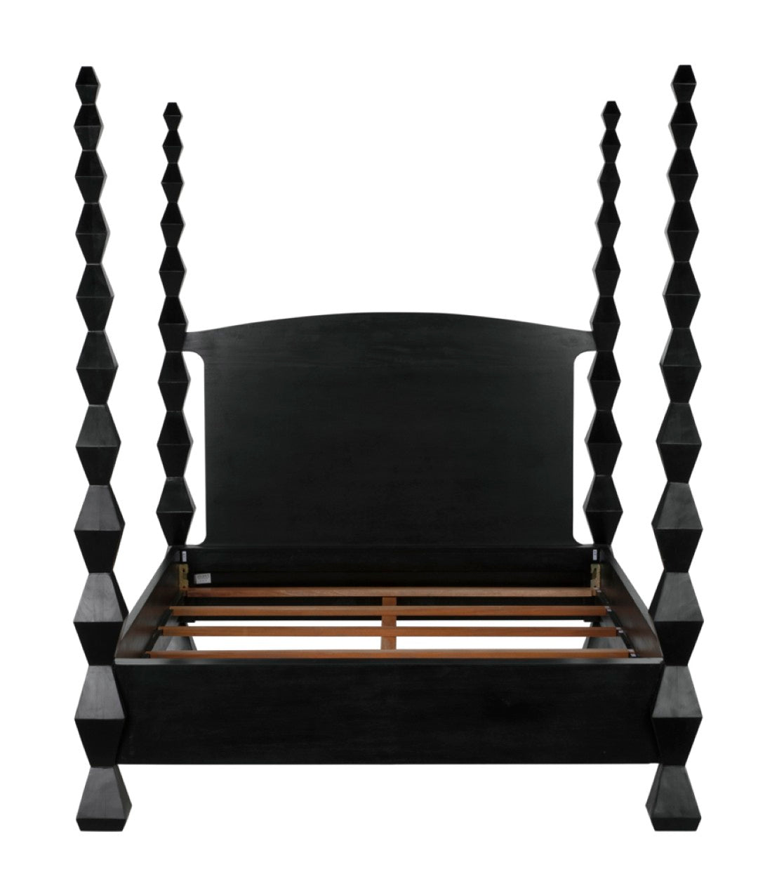 Evoking the clean lines and sculptural presence of modernist art, this four-poster bed becomes a striking centerpiece for a contemporary or transitional bedroom. Crafted from solid mahogany with a hand-rubbed black finish, the design highlights dramatic hourglass posts that read like totemic sculptures while providing a sturdy, luxurious foundation for restful sleep.