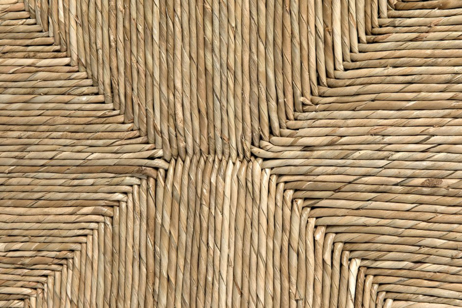 - Materials: Solid mahogany construction with rush (sea grass) accents and veneer details for visual texture